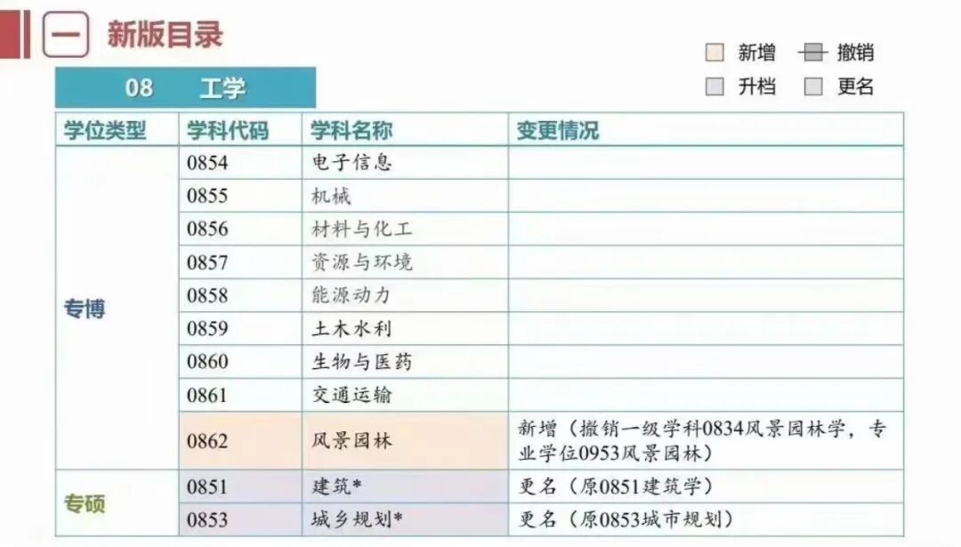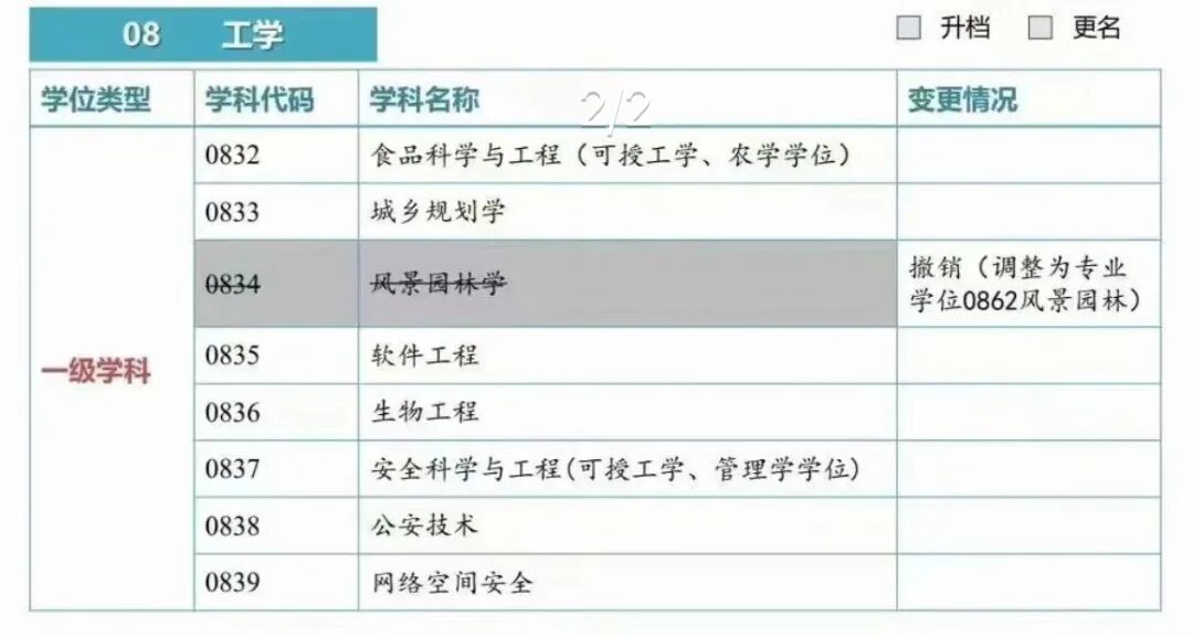 风景园林学科原来的(学科代码:083400)没有出现在文件中,新增工科下的0862风景园林。