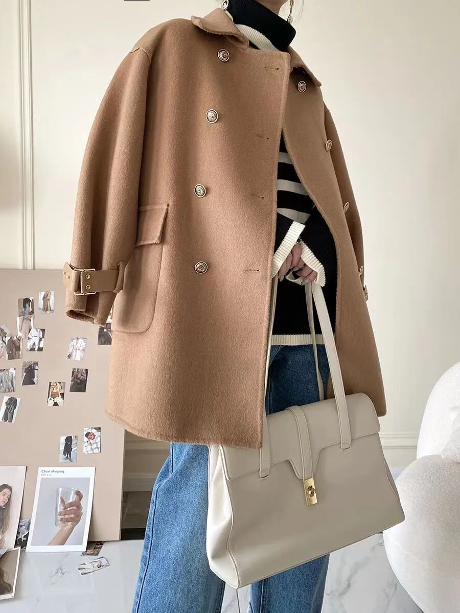 也是百分百高支羊毛面料,细腻紧实,保暖性好,上身利落挺括,感觉是不知道穿什么随手一拿就能出门的那种。