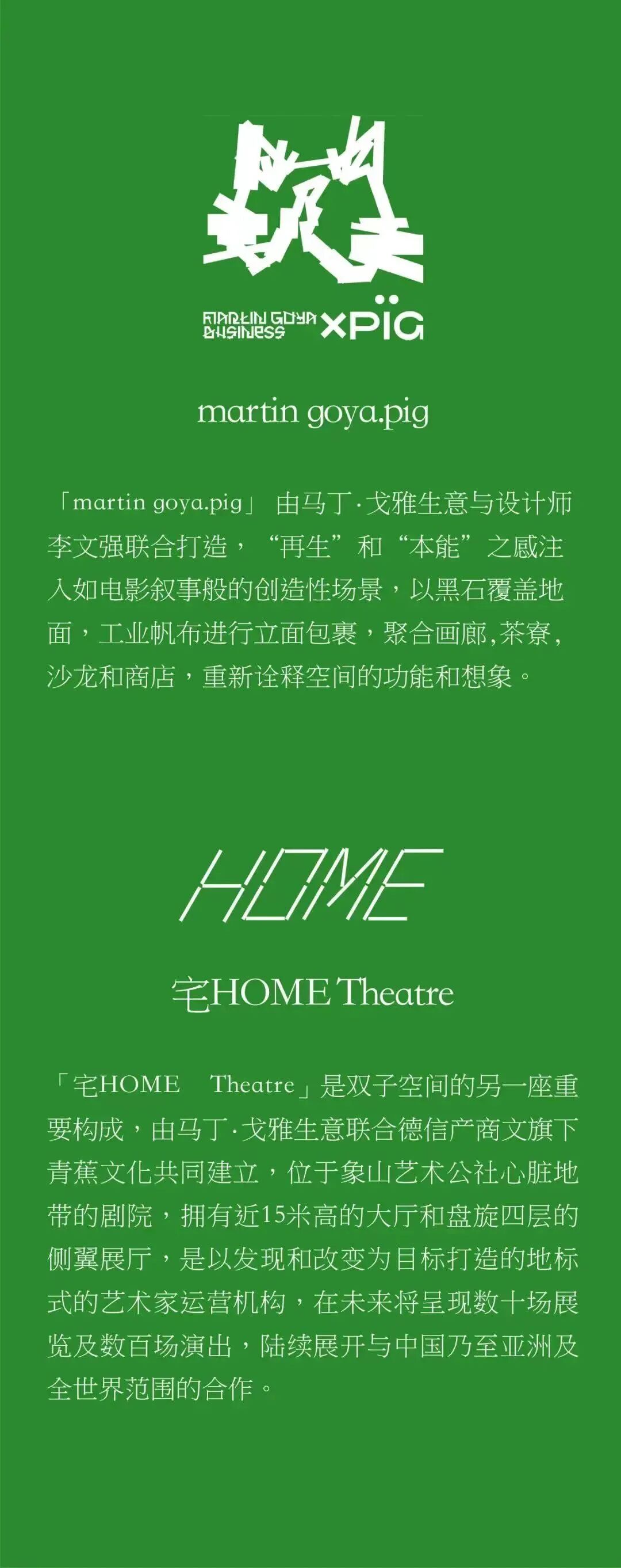 马丁•戈雅生意(Martin Goya Business)由艺术家程然创办,作为推动多元青年文化的先锋平台,马戈生脱离固有的艺术体系模 式,致力于推动和支持本土青年艺术家多样性实践和探索。马戈生也与潮流时尚与前卫概念紧密相连,以独特的气质塑造 具有引导性的超前视觉文化场景。