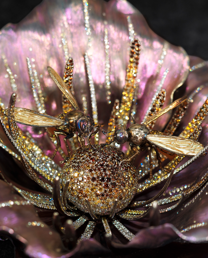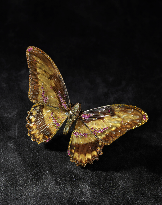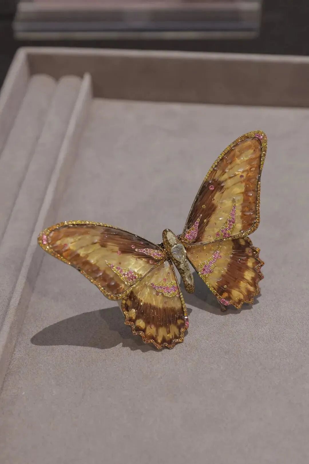 本次秋拍还呈现了陈世英的另外一件佳品——宝石「希望」胸针,他的厉害之处就在于每一件珍品都有灵魂。这款胸针依旧由钛金属雕塑而成,蝴蝶仿佛一直在飞舞,带去了满满的希望。观赏陈世英的每一件作品,都是一种享受。