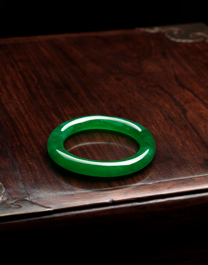 翡翠手镯通体呈饱和绿色,色泽非常浓郁,种水细腻而通透,是难得一见的瑰宝。