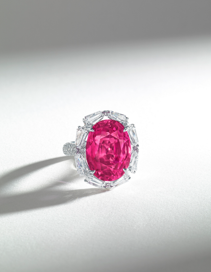 粉红色蓝宝石是一种产量较小的宝石品种,因此非常稀有。这款19.61克拉椭圆形缅甸天然粉红色蓝宝石戒指贵就贵在其「色彩」。