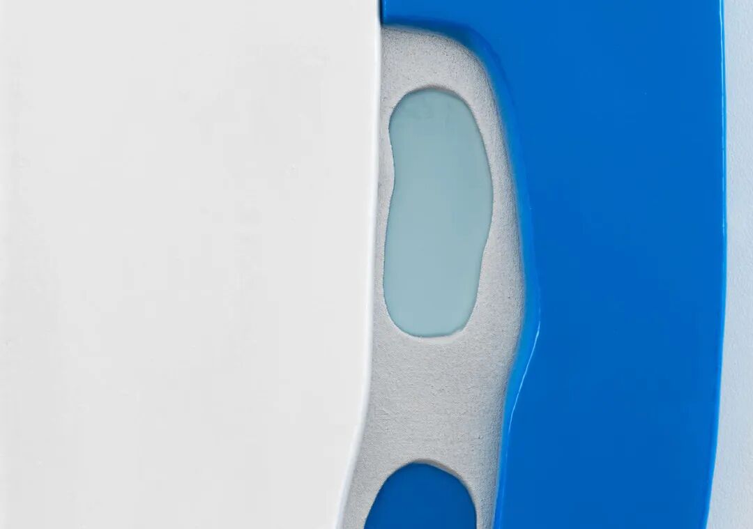 而尽管艾迪恩艺术语言中毛毡面料创造出的有机形态,以及明亮粉彩色调让人觉得充满玩趣,但艺术家却始终致力将自己作品成功的呈现为抽象画作。这其中的共通之处,便是抽象画家在过去一个世纪以来,不断努力摆脱一切形式束缚,追求自由表达的宗旨。贾斯汀·艾迪恩运用缤纷色彩与奇异的结构,打造出巧妙的抽象浮雕,更允许艺术家自由穿梭于绘画和雕塑之间。他使用了柔软的形体,最终呈现出抽象的、仿佛碎裂的陶瓷般质感,也揭示了构图所打造的张力以及对材料表现力的精准掌握。于是我们便愈发能理解艾迪恩所想要传达的艺术理念,其根本上还是依循着绘画本质:追求形式以及形象化,艾迪恩的作品仍是周旋在颜色和形状的配置调度之中,基于原本的二维彩色平面空间被扩展,并令人惊喜地增添了柔软物质性的感官维度。