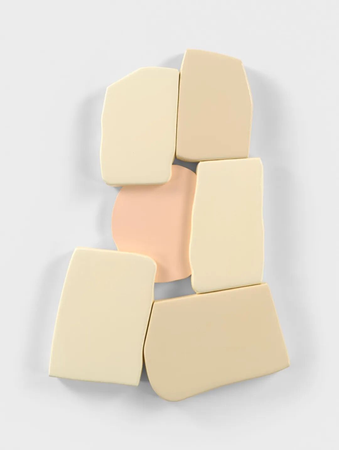艾迪恩总会在手边放一本笔记本,随时绘制作品草图。这些草图都是非常简略且示意的,通常只是关于形状的想法,以及这些形状中可能产出成为成功作品的各式组合。而艺术家将这些草图转换为最终成品的过程,往往会发生很大的变化。尤其是运用想象、相对自由的随手起笔,在遇上了画布、毛毡和面板等材料后,往往需要艺术家转换一种更为现实的态度来思考如何实现作品。这其中包括对木材所进行的裁锯、磨砂与挖空等工艺,也都被艺术家视为绘画过程的延续。接着毛毡面料被拉伸到各式形状的木块之上,再以画布覆盖。我通常从草图便会开始,探索整体构图的概念。不过,作品的最终形态其实是源自一个相当自然有机的过程,我会不停拼接组装我所创造出的部件,合起来后再拆开,这样自由的重复尝试。当我将这些元素组合在一起时,我也接受它们随机的找到定位后的摸样。接着便进入绘画阶段,我会将每个物件单独以颜料涂制成一个色块,艺术家解释道。而作品内层的毛毡材料则赋予这些形状柔软质感,看似松软的质地也让人产生了禁不住想要触摸的想法。看似软垫触感的作品,如同软绵的枕头或脸颊曲线,渴望被轻柔抚摸。在唤起了观众对于枕头或皮肤的联想同时,也激发了每个人内心柔软处的同情心,在作品和观众之间培养出了深刻且人性化的亲密关系。