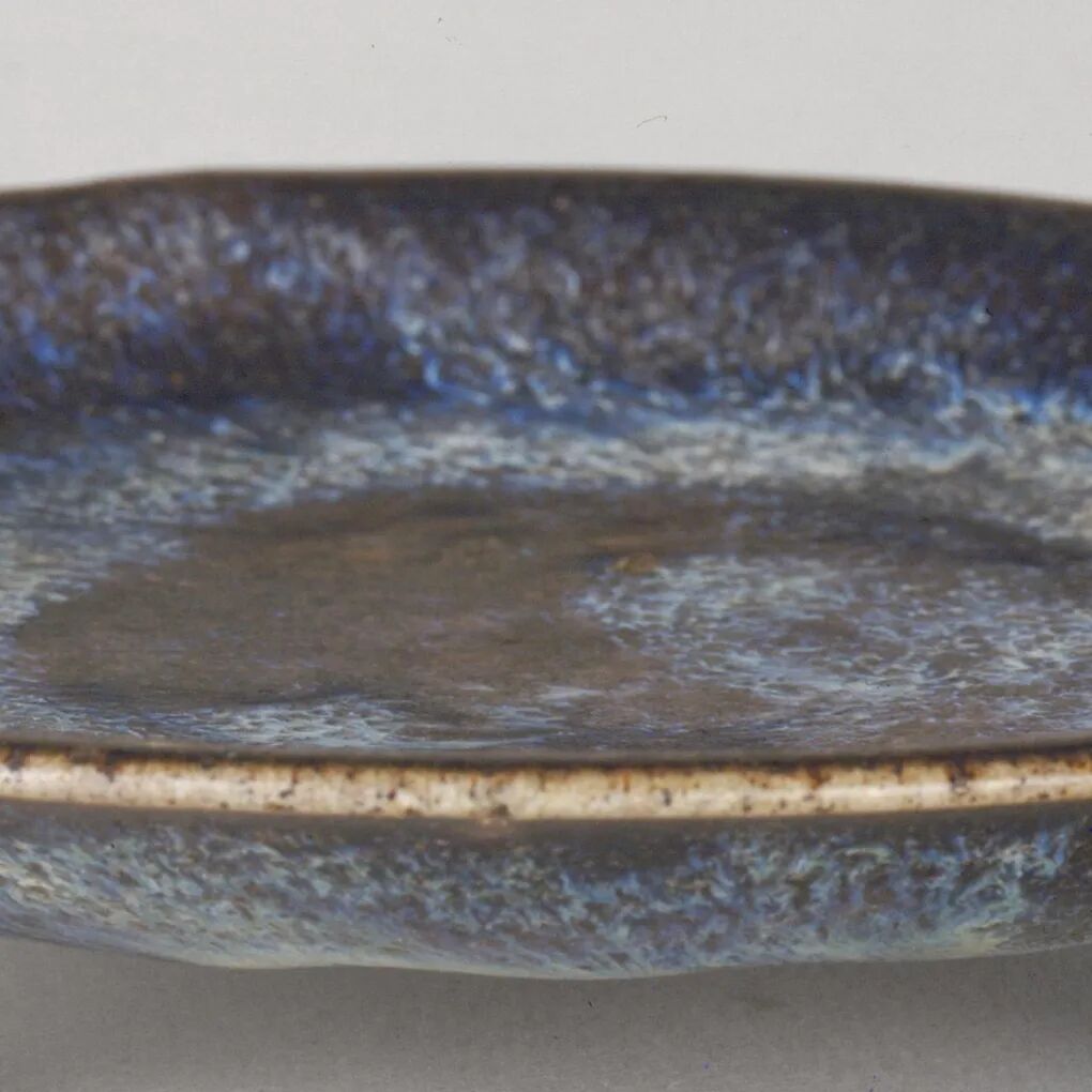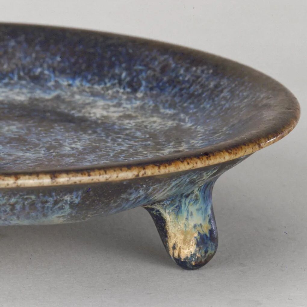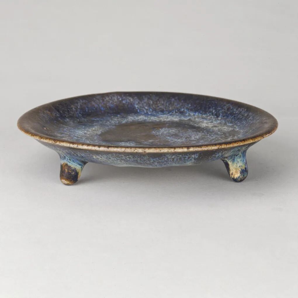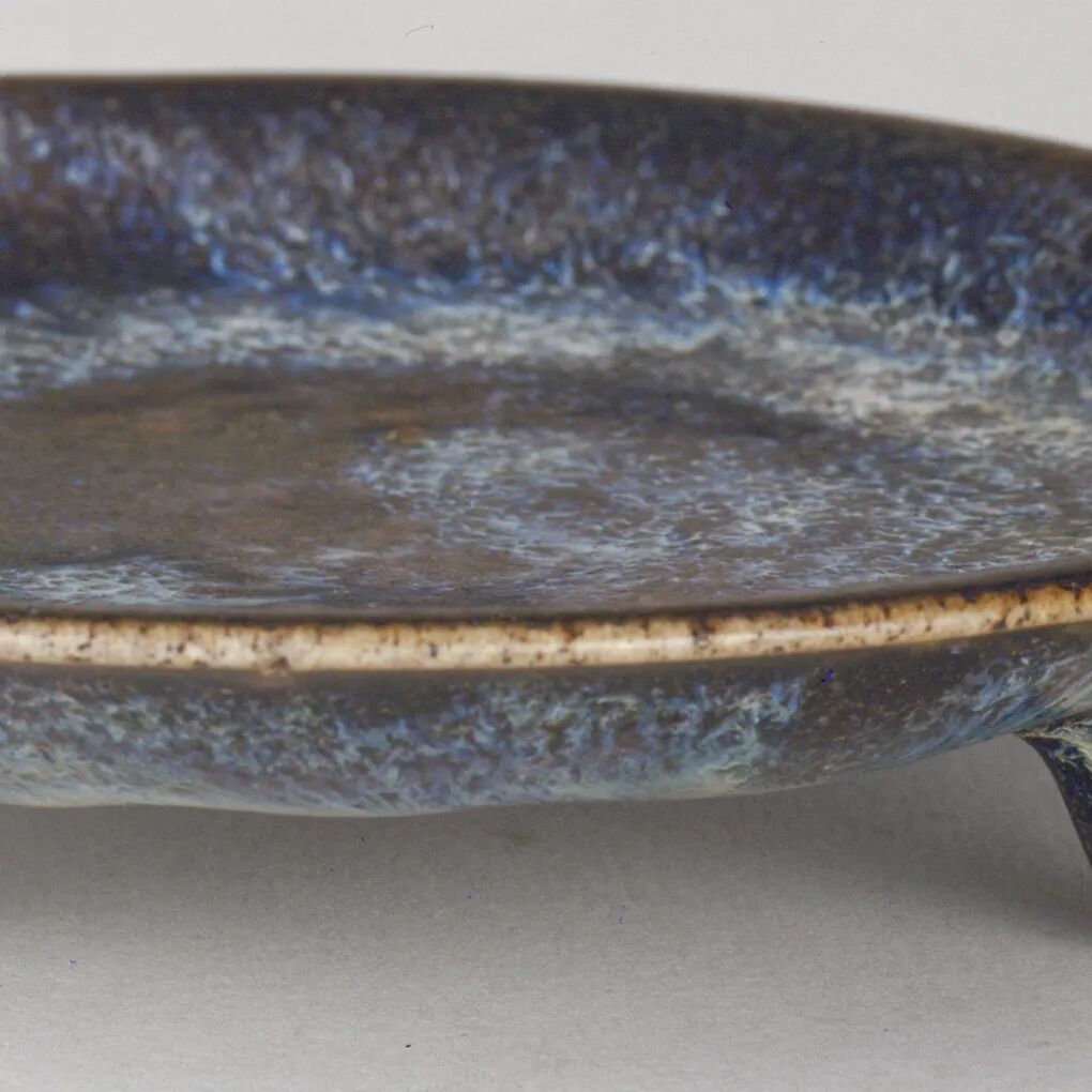 大家好!今天给大家介绍唐代文物《郏县窑黑釉蓝斑三足盘》,高2.9厘米,口径15厘米,足距10.2厘米。