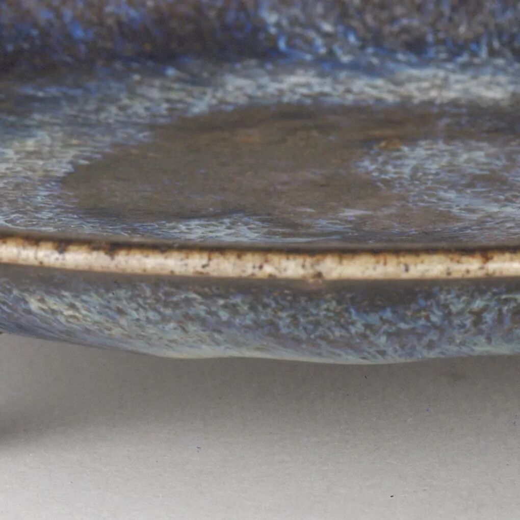 盘敞口,盘心坦平,下承以三足。通体内外施釉,黑色釉地上呈现蓝、白交融的花斑。外底中心无釉。