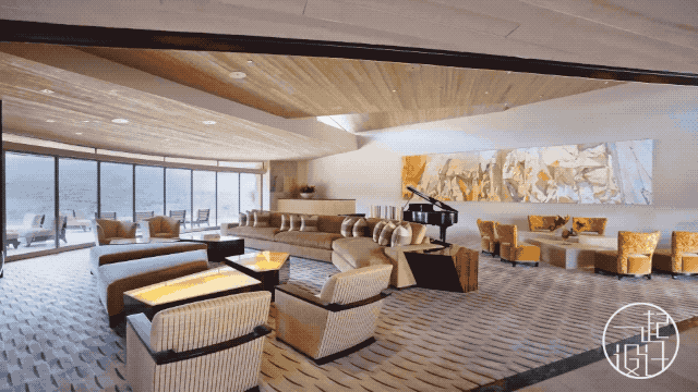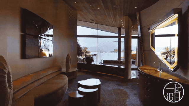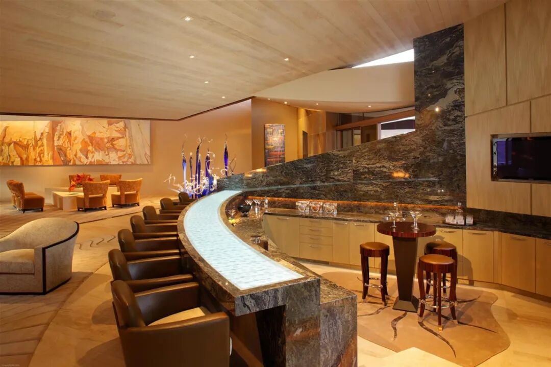 会客厅又被主干道分成左右两个部分,右边是一个弧线形吧台,用于更有情调的喝酒聊天场所。