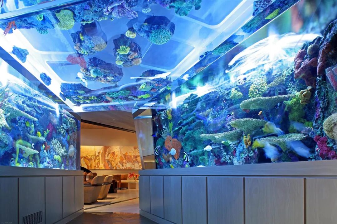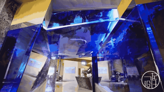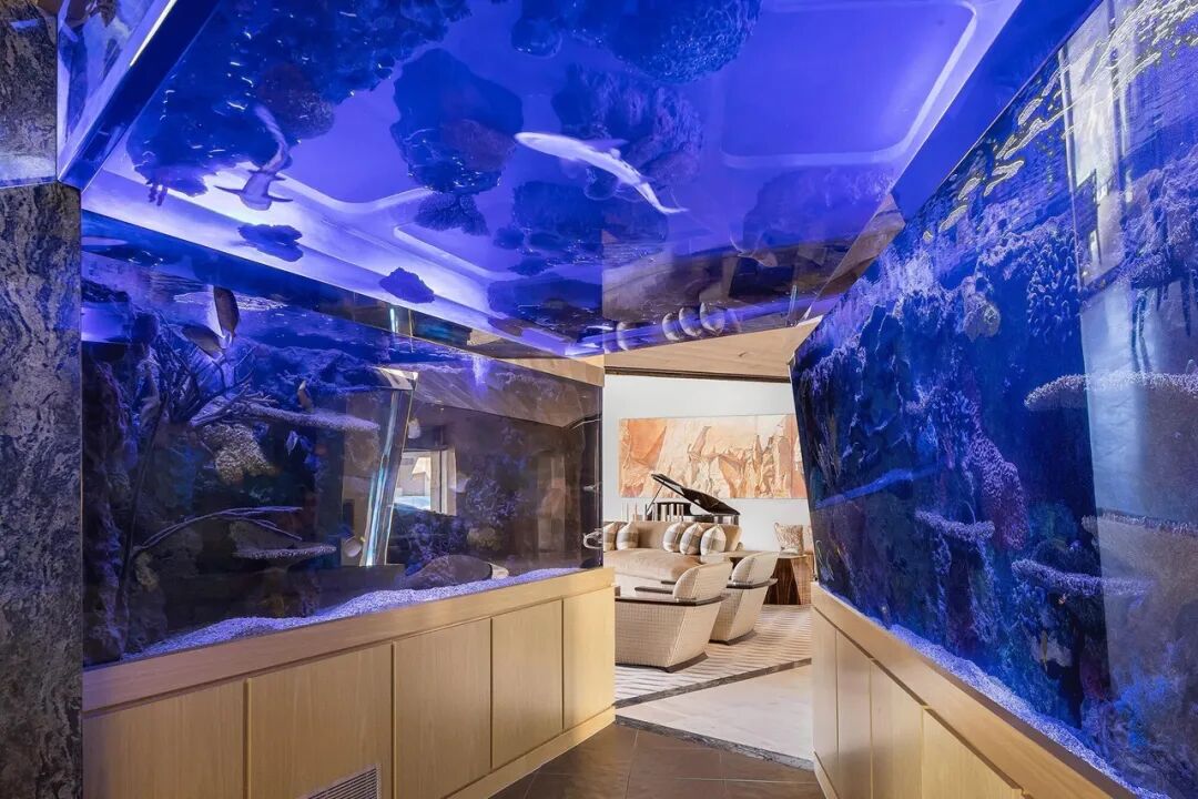 隧道由两个鱼缸(左右两边)和一个鲨鱼缸(上层)组成。