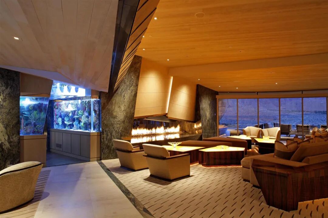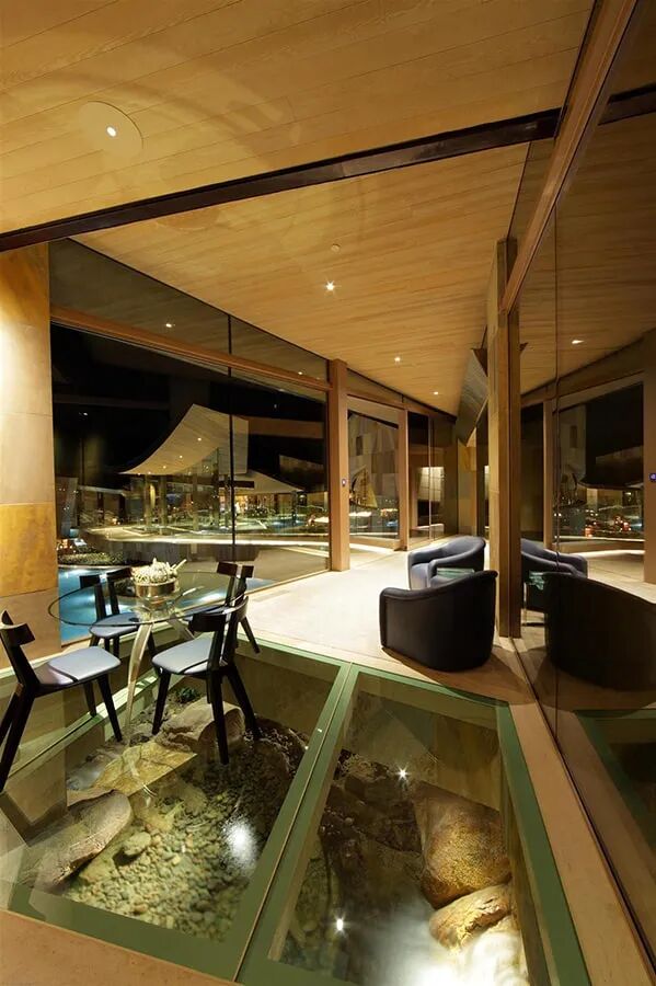 部分连接室内的廊道甚至会做成玻璃地面,坐在上面休息的感觉如同悬浮于池水之上。