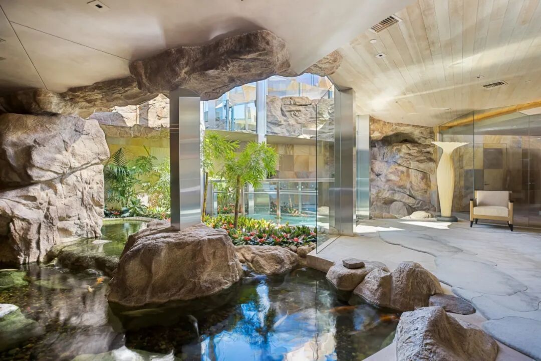 人需要通过玻璃电梯进入主楼,入口处有锦鲤池作为水景。