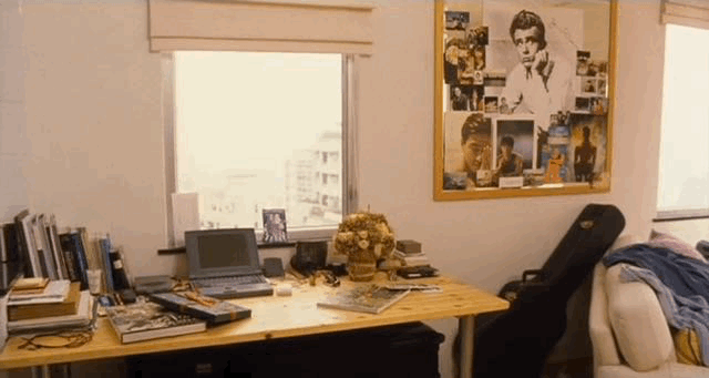 吴彦祖所置身的单身公寓,空间有限,但采光极佳。软木板上装饰着各类明星海报,一幅巨大的詹姆斯·迪恩海报,可见屋主喜好。