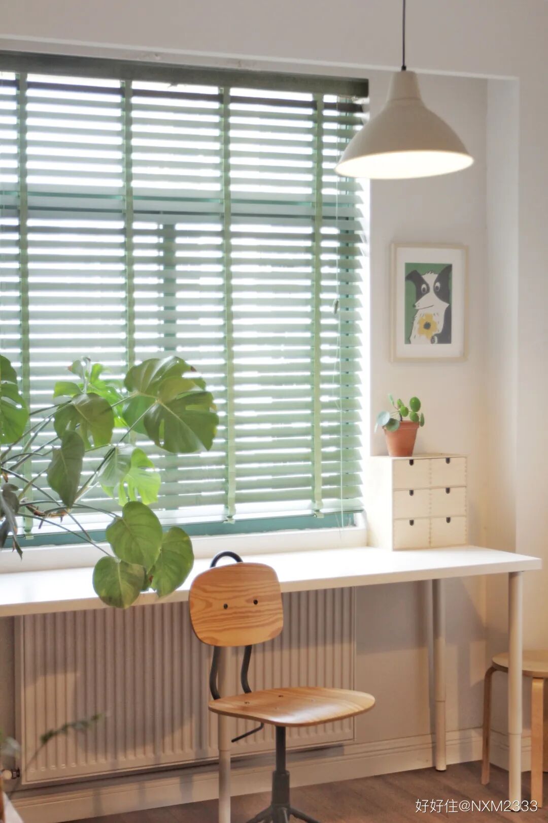 住友@NXM2333 干脆沿用了王家卫色调,在白色基调的房间里选用了绿色百叶窗,自带夏日的清凉感。