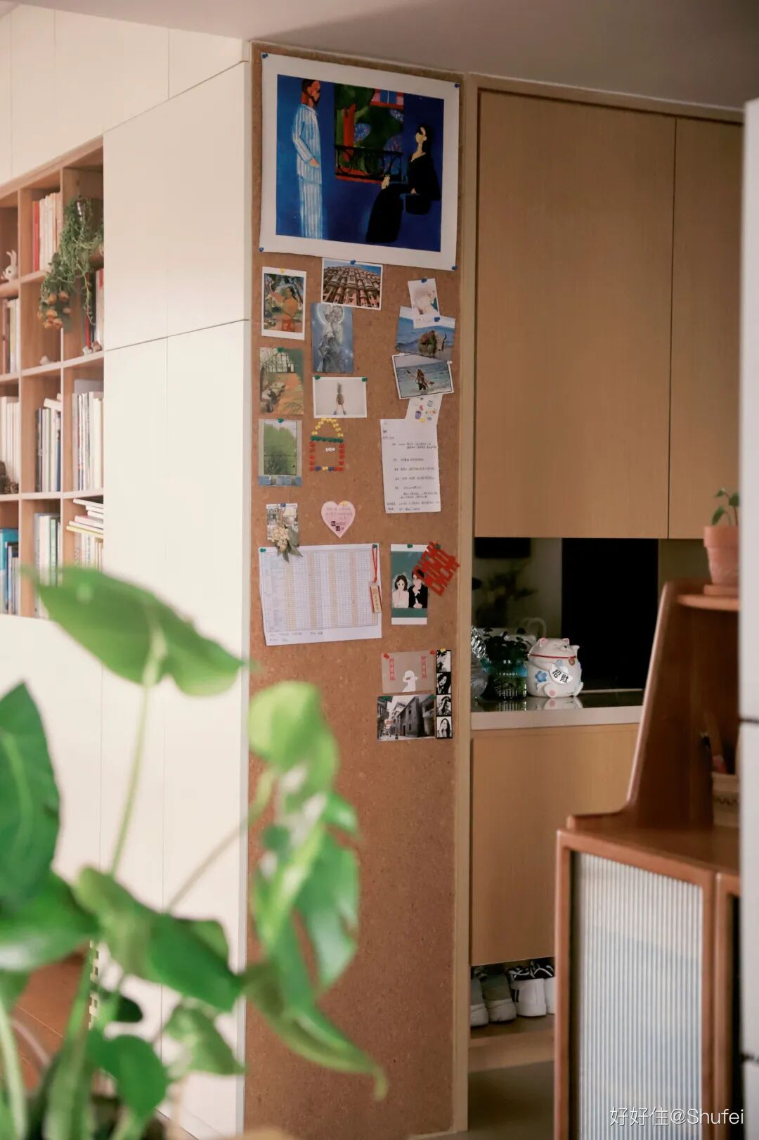 之前分享过的住友@shufei 家,就是在玄关鞋柜旁做了一个顶天立地的软木板,算是专属自己的回忆记录墙。