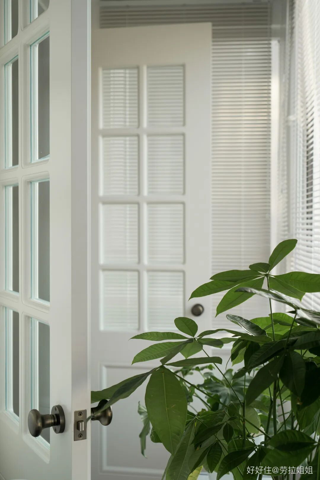 刚装修完工的住友@劳拉姐姐 ,就在次卧与阳台连接处做了一扇双开门。它的形态与张曼玉家的这款极其相似,双手推门也带来了恰到好处的仪式感。