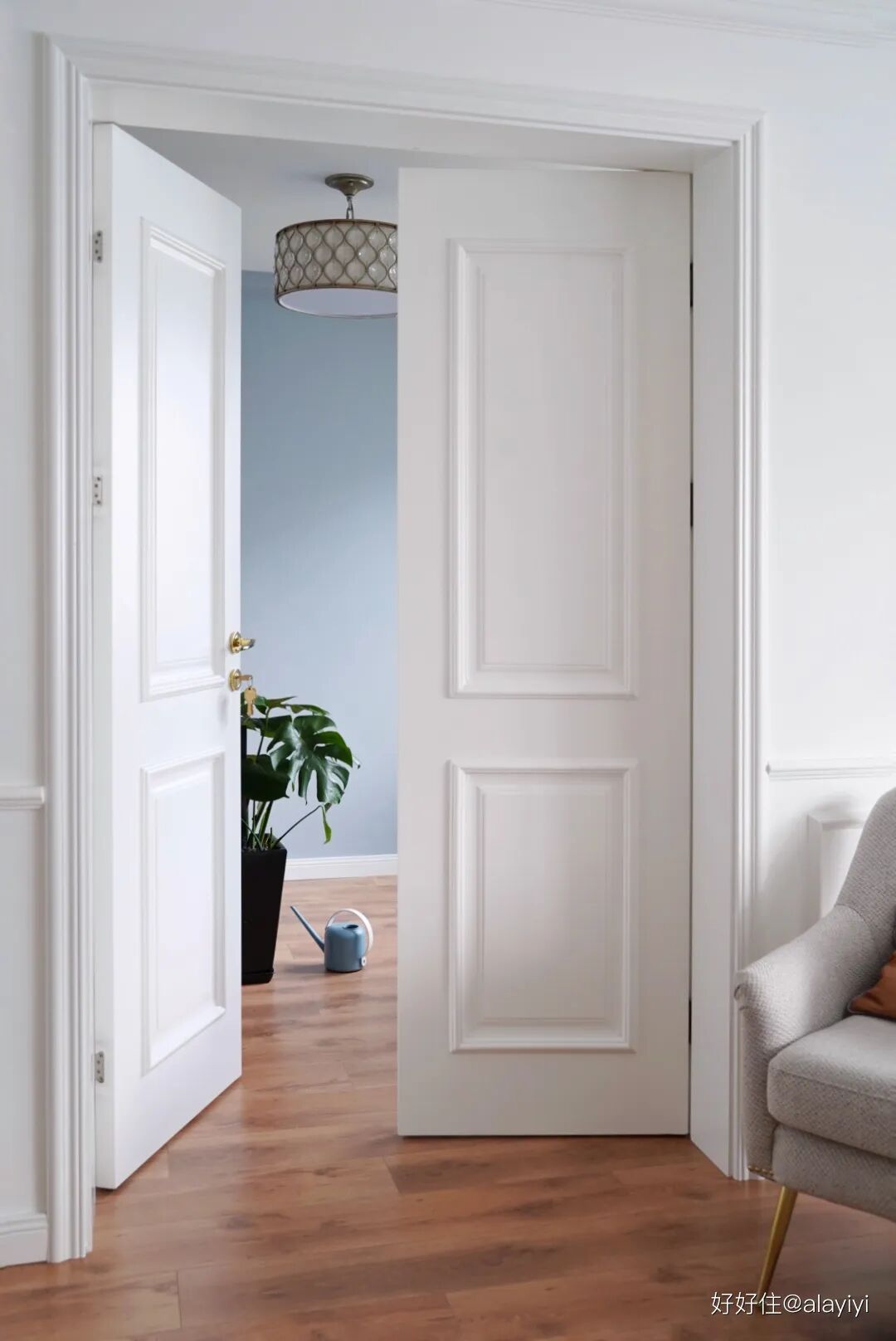 住友@alayiyi 则为了客厅的颜值,不惜牺牲部分次卧的利用率,将室内门做成了双开门的形式。推门步入其中,体验极佳。
