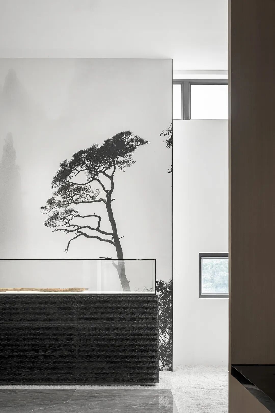 设计再以黑灰两色为平衡,对比中有提升,亦有克制。温润的大理石材质在日光下闪烁出融暖光泽,看似随意的纹路为空间添增水墨质感,映衬木质肌理,沉香如大自然的鬼斧神工,以自在神态,抚慰着这个禅意世界。
