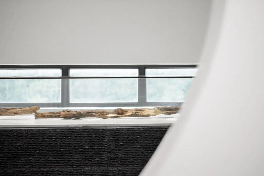 横向延展的木质线条,主导空间走向,为每一停驻的景致增添决定性指引。柔和而深浅错落的自然色彩,在白、黑、灰的映衬中更显通透,时光是宇宙最神秘的工匠,在此天赐灵物上,一笔一画雕刻出岁月走过的印迹,伤痛,愈合,沉寂,繁盛,皆展露无疑,在围合意境的维度里,为人、器物、光影、线条、色彩注入契合气韵,共同恪守着神秘的平衡法则。