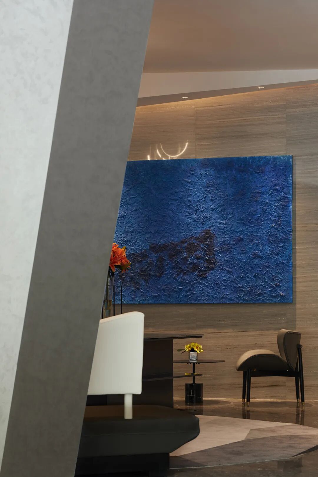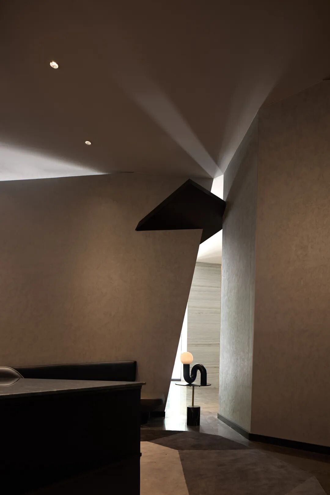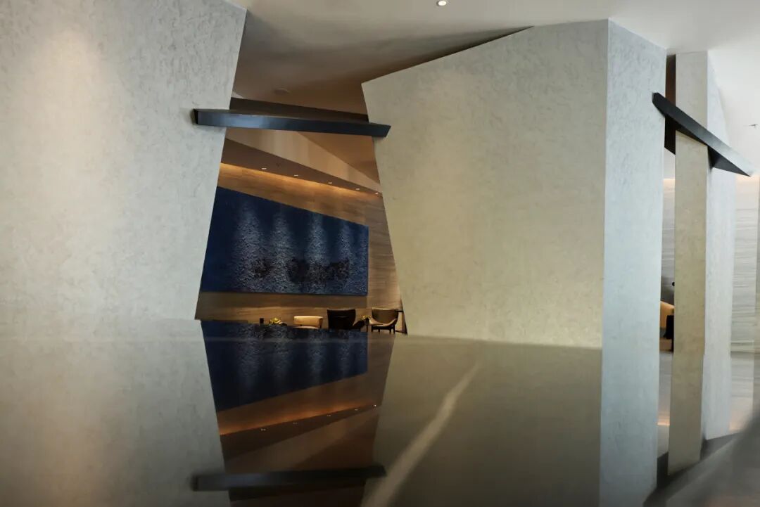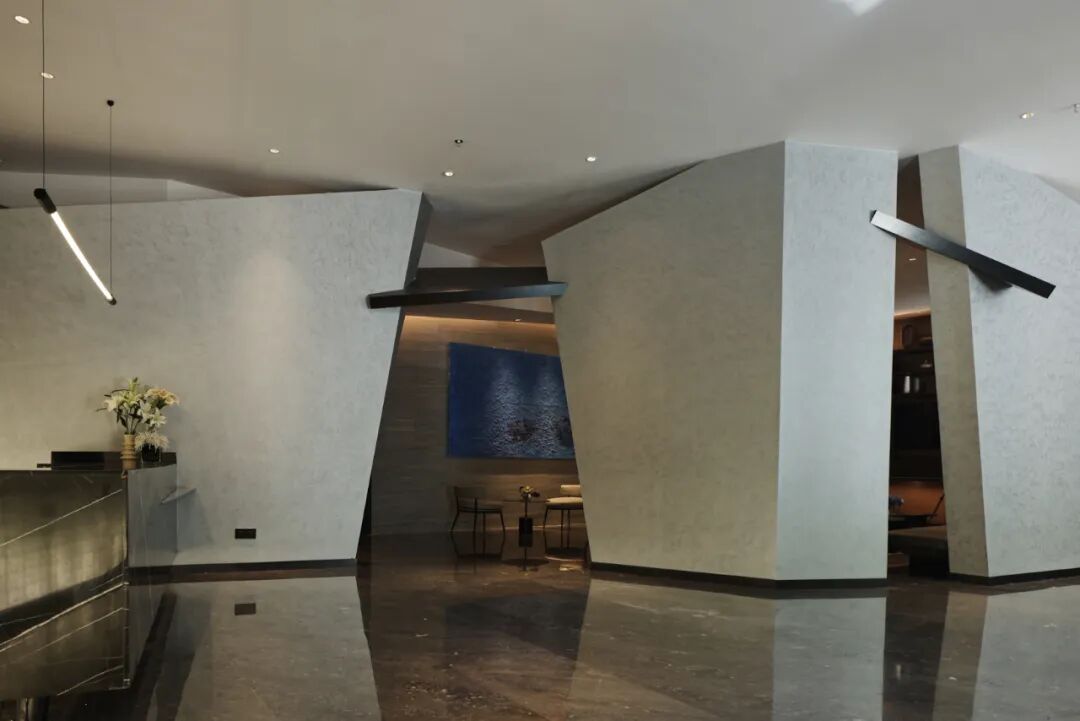 进入酒店的一楼是接待区及会客区。这个空间被置入了一个硕大的雕塑墙体,自然的把空间分成了里外。用几何形体解构与切割的方法来表达当代感。