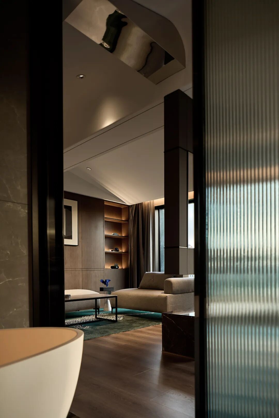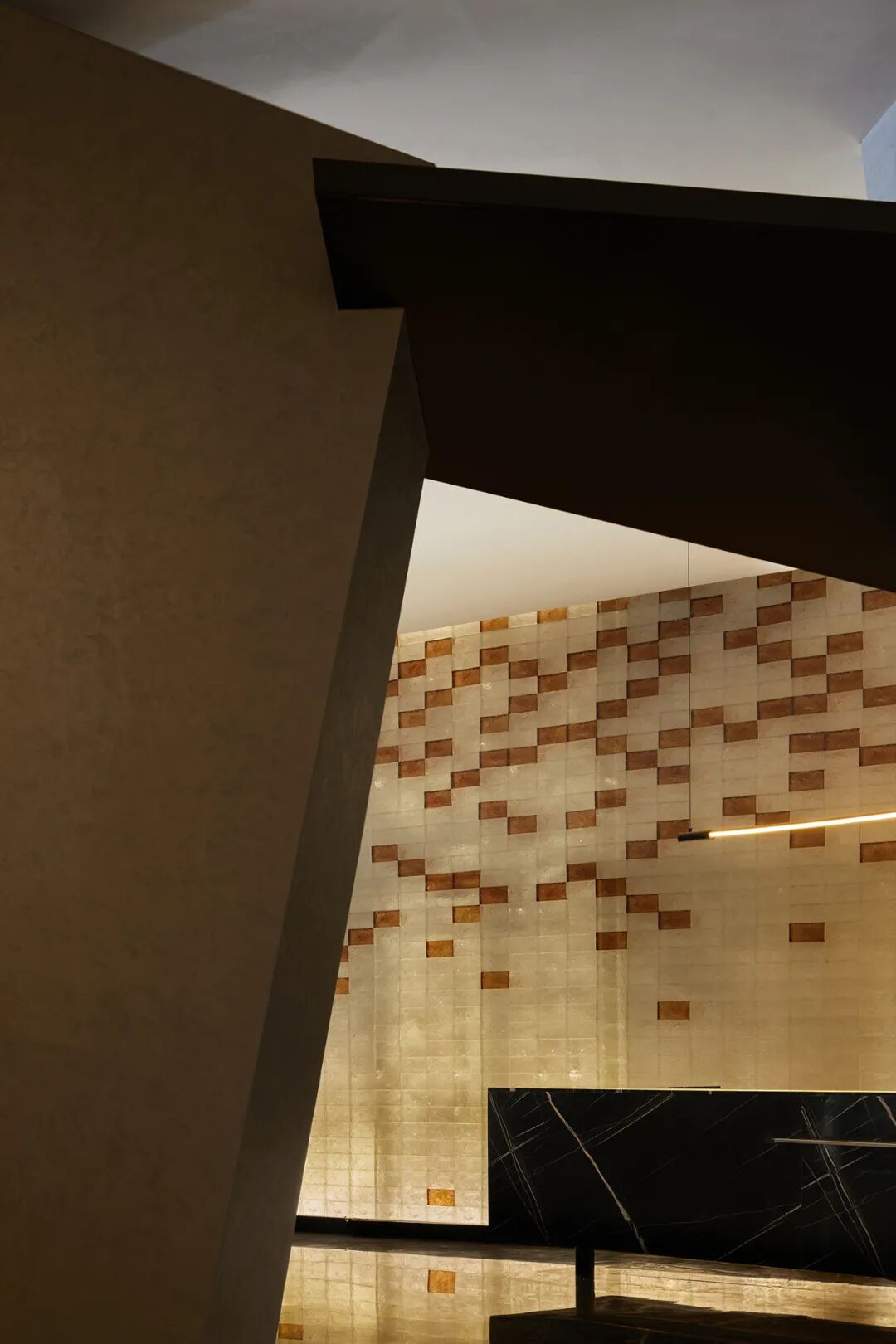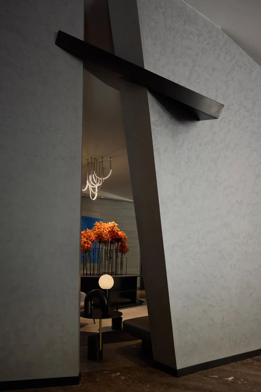 进入酒店的一楼是接待区及会客区。这个空间被置入了一个硕大的雕塑墙体,自然的把空间分成了里外。用几何形体解构与切割的方法来表达当代感。