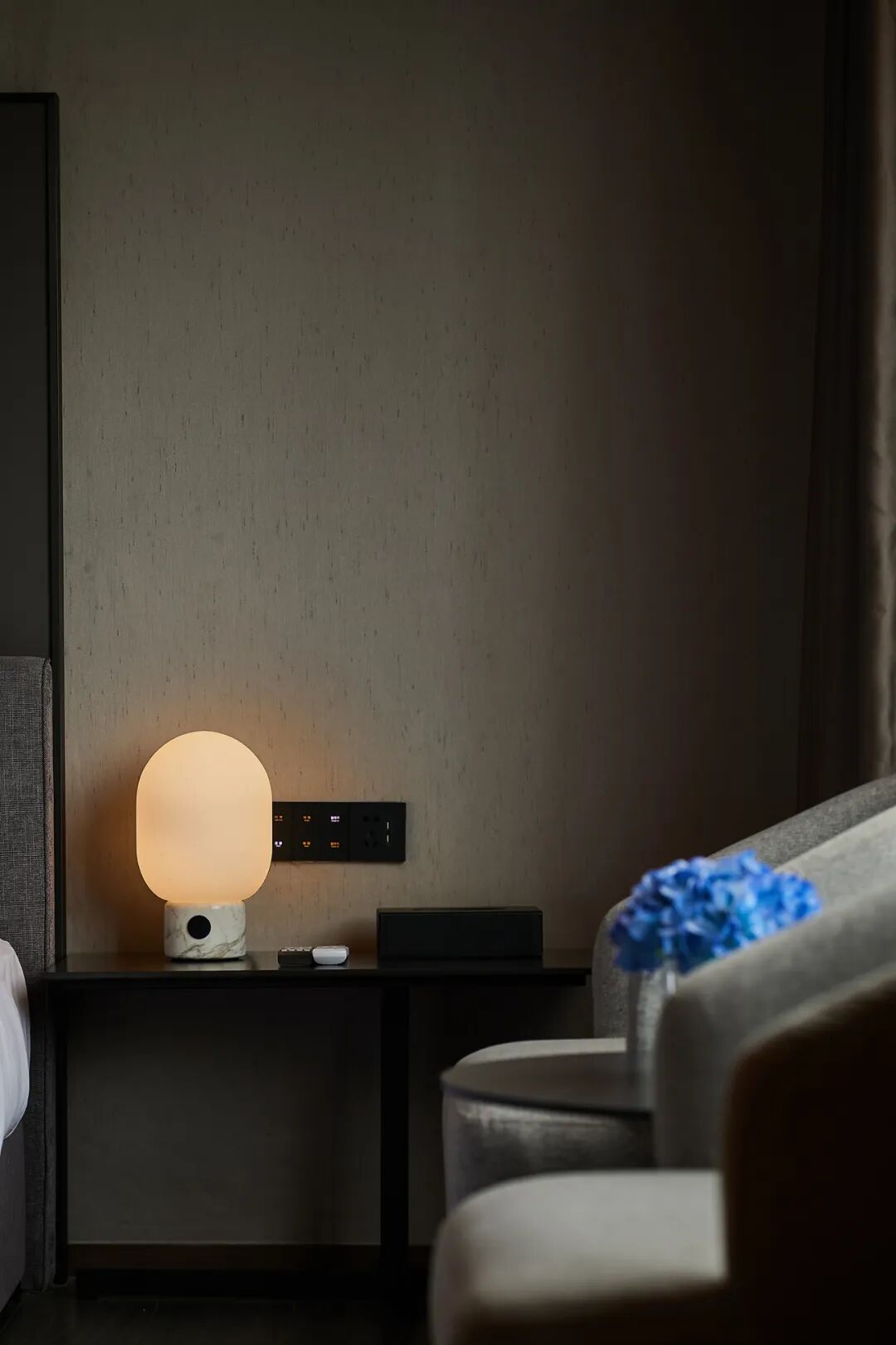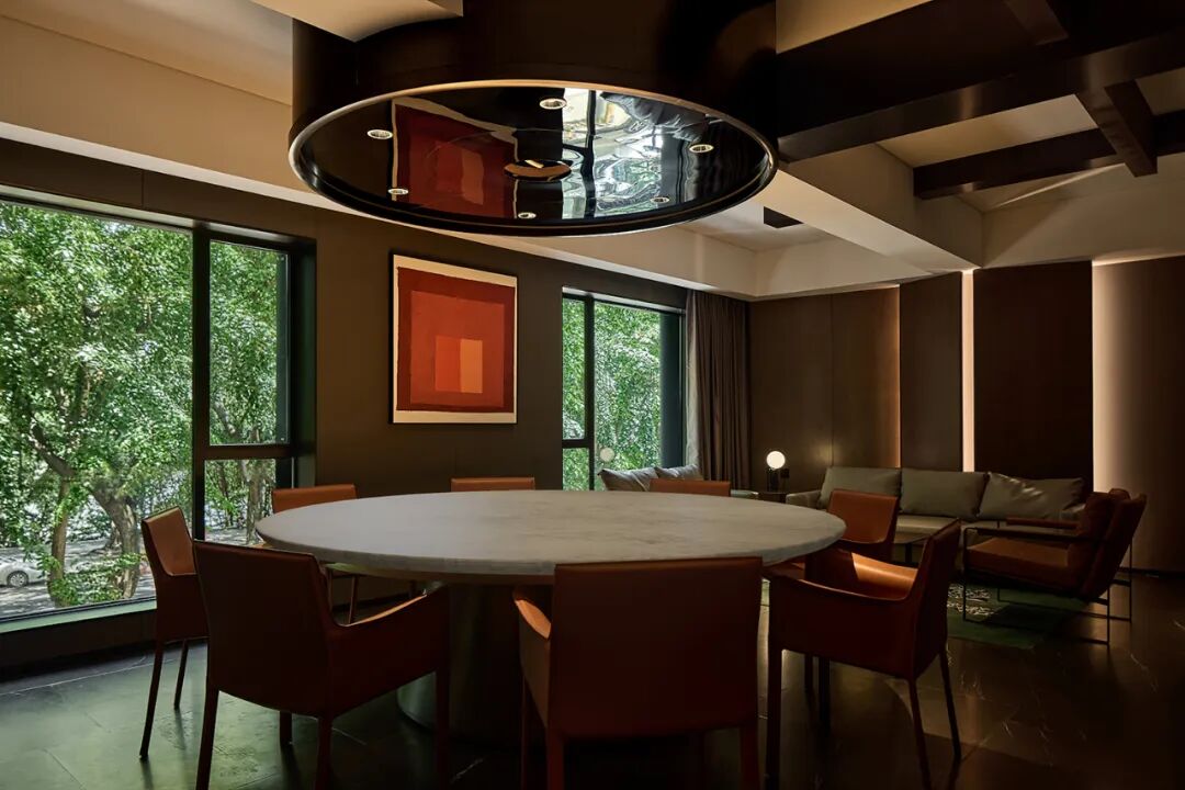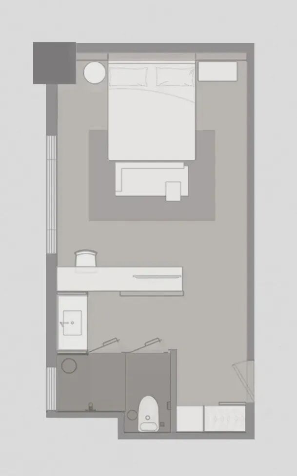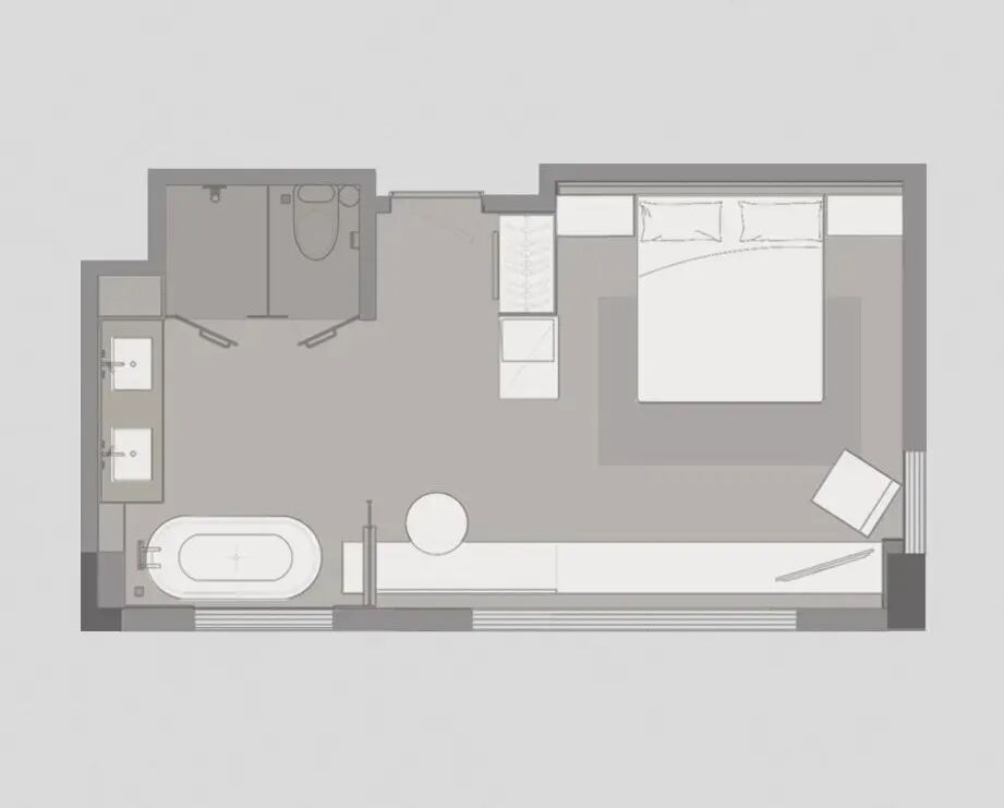 50平米套间被设置在酒店的高楼层,拥有最好的视野和朝向,河岸风景一览无余。采用"借景"的方式将户外的城市景观引入空间。在空间上分为会客区和休息区,满足年轻人对空间的多功能使用。