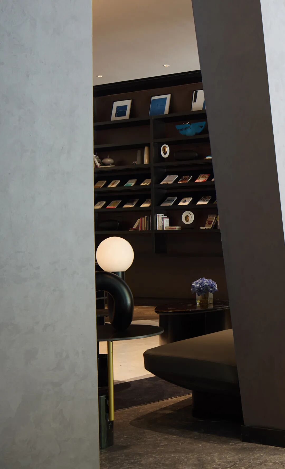 休息区的座椅围着花台摆放,保持了一定的空间距离,用书架营造出书房会客厅的氛围,和散落在各处的艺术品呈现出一种艺术气息。