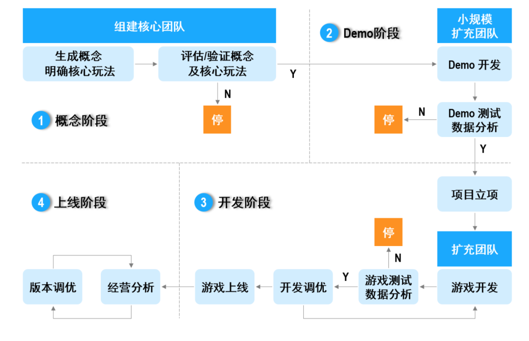 财报也提及了吉比特「小步快跑」的研发模式——公司在项目初始阶段搭建核心团队,根据创意策划思路尽快做出原型,并通过泛用户测试验证核心玩法可行性。在后续项目研发过程中,持续快速迭代更新并根据测试数据调优,反复进行验证。具体流程如下: