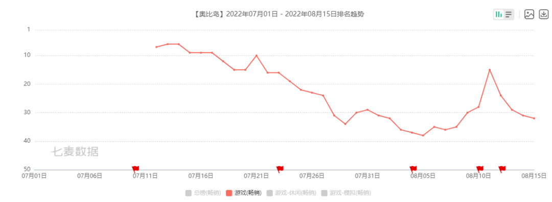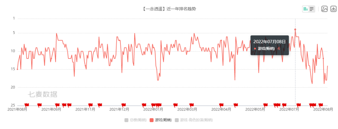 从上表中,我们也能看出《一念逍遥》和《奥比岛:梦想国度》是吉比特目前的主力产品。其中《一念逍遥(大陆版)》于 2021 年 2 月上线,至今游戏iOS畅销榜排名一直稳定10名左右。此外,在今年7月8日版本更新后,游戏畅销榜排名升至第4名,再创日排名新高。
