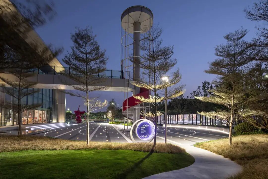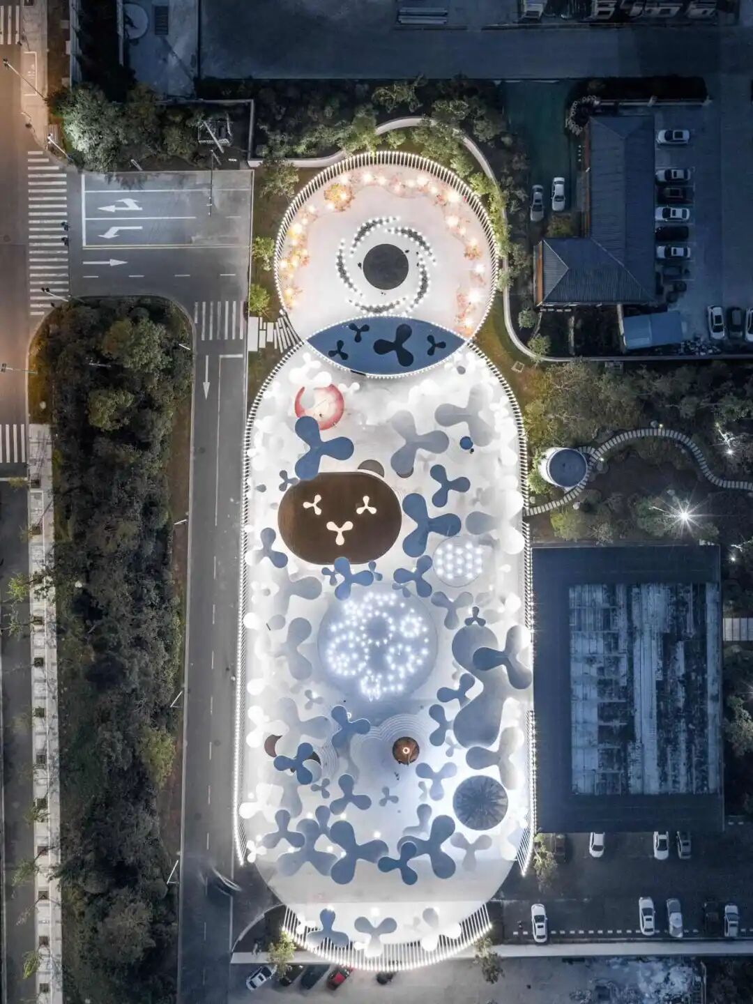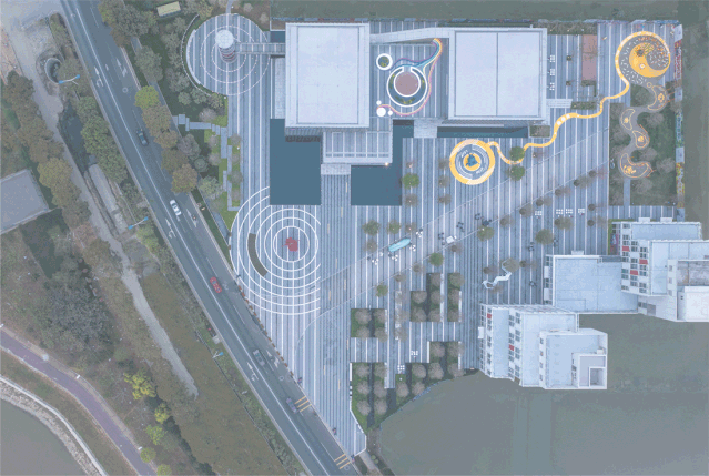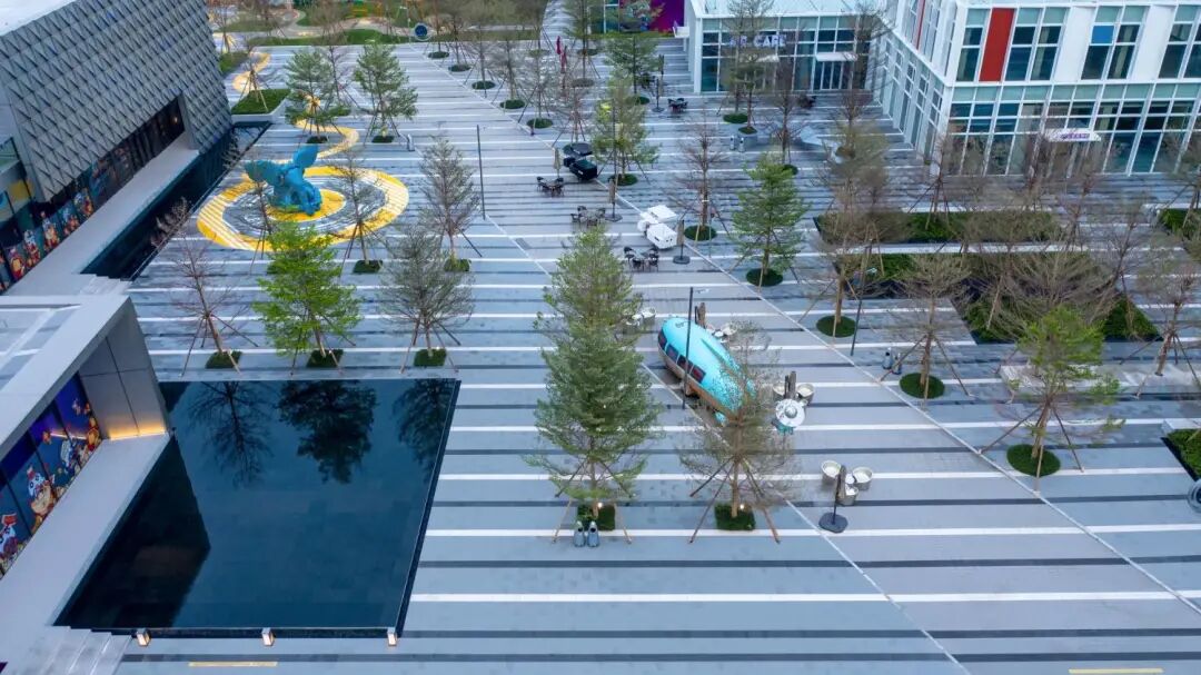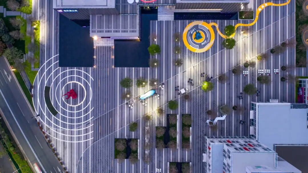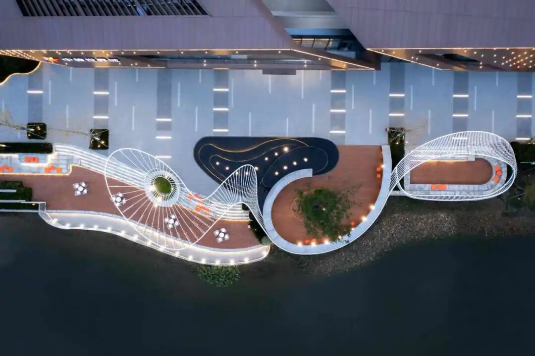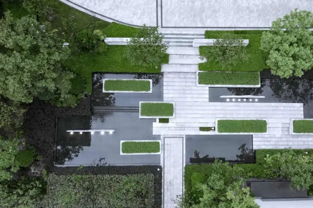 树木枝干营造江南油纸伞的观感,漫步在树影间,产生朦胧的感受。林下坐凳给人们提供洽谈休闲的场地,点缀了空旷的场地。人们拾阶而上,寻光落座,体验舒适。