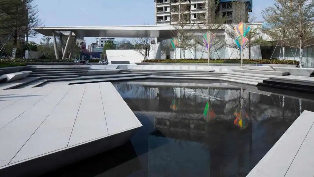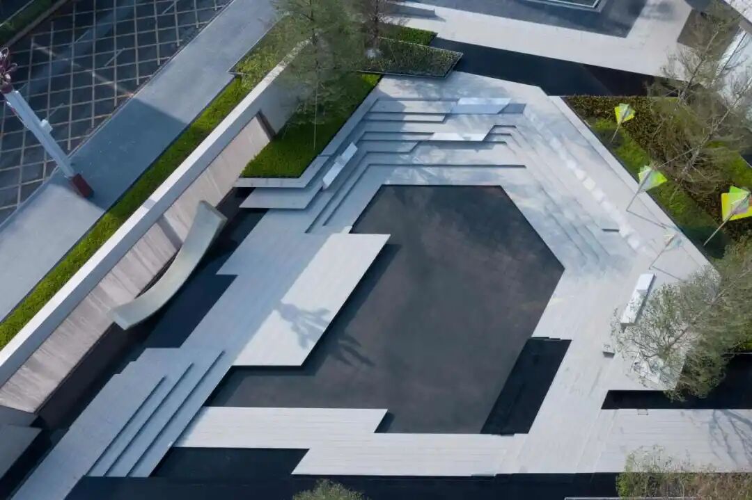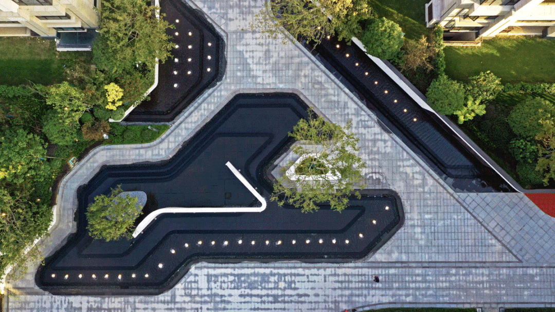 下沉水院,随着水幕的开启和水位的变化和城市形成或隐藏或展开的立面。