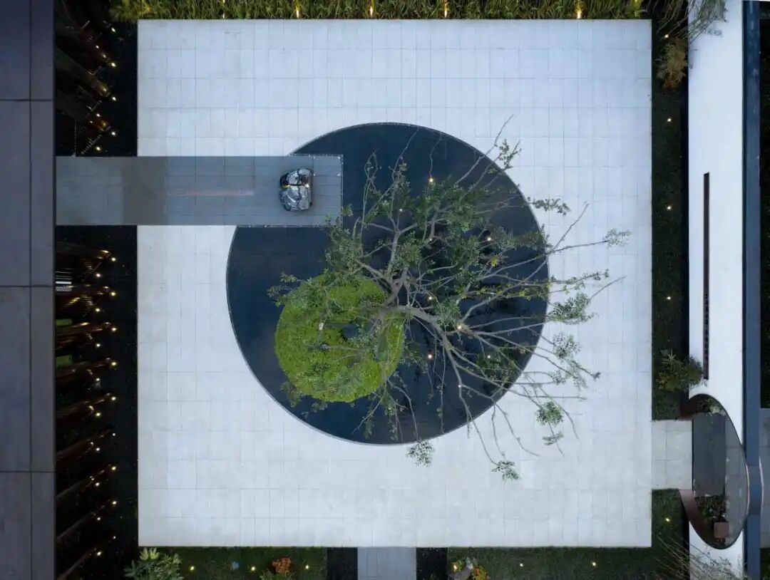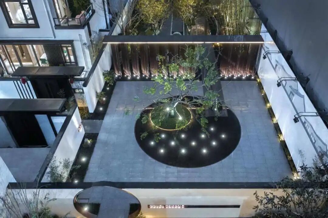 光之庭的打造,如同广阔山脉里的洞穴,围绕一棵大皂角展开的下沉庭院,结合一条石凳,提供了一个静谧冥想的空间,隔绝远处的喧嚣,感受自然之中的光影变化。