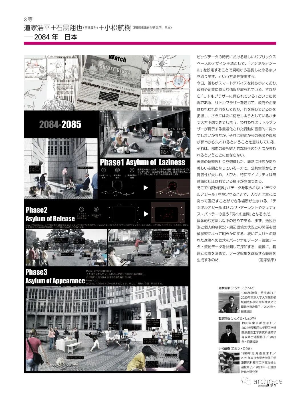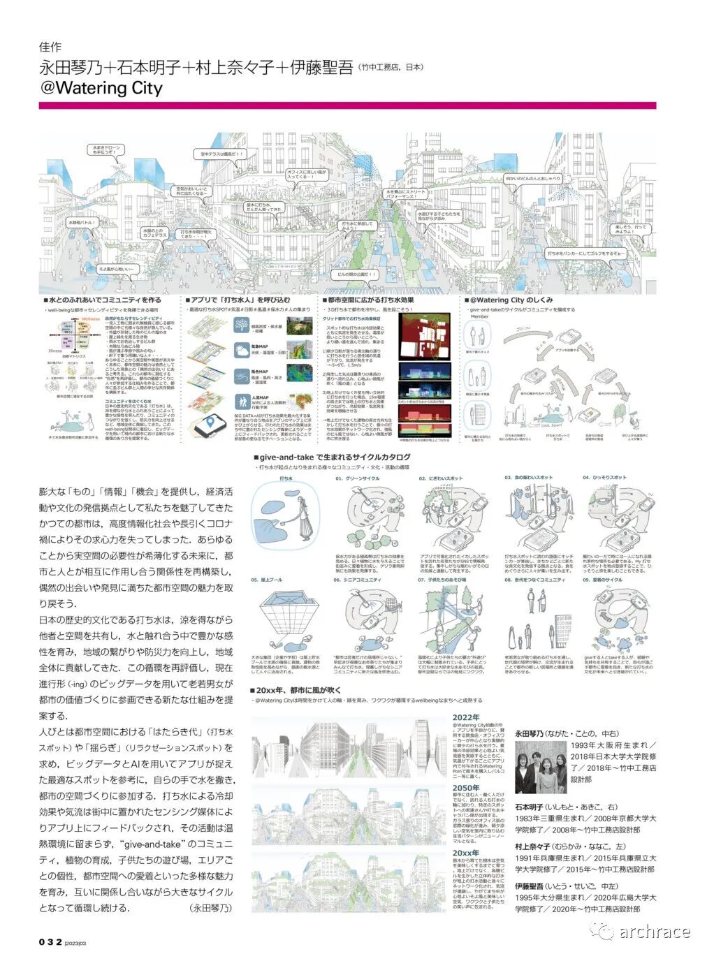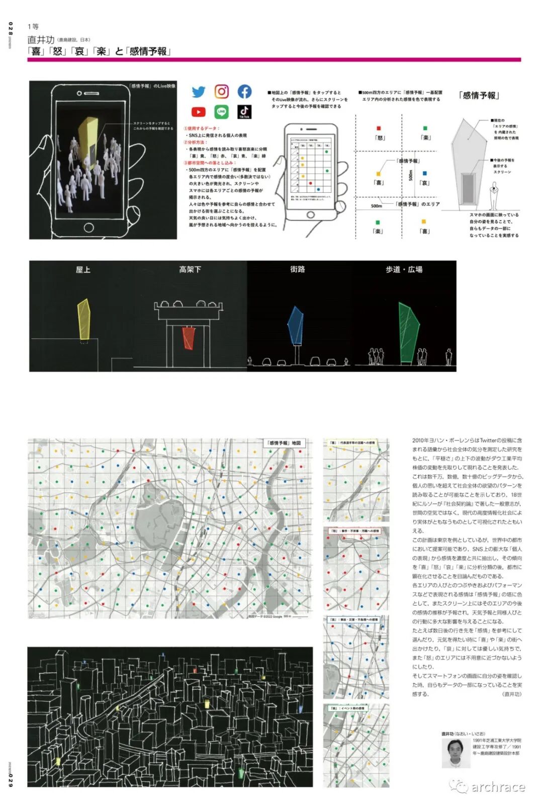 竞赛背景情况 今年3月,一年一度的新建筑住宅设计竞赛的结果发表在了最新一期的《新建筑》杂志上,这届竞赛的主题是:大数据与城市─幸福空间设计。竞赛寻求利用大数据的建筑和城市空间设计。本次竞赛将评选使用某种形式的数据并将其分析结果纳入空间设计的提案。竞赛可以使用具体的数据,也可以是假想的数据,如果参赛者有权获得这些数据的话,可以以特定的方式使用它。任何规模、任何类型的数据都可以接受,但必须满足以下三个条件:1)必须是可以使用的数据;2) 必须提供分析数据的框架;3)分析结果必须纳入建筑或城市空间的设计中。 本届竞赛共收到了117份参赛作品,其中来自中国的参赛作品有30件,竞赛最终共评出了3个获奖作品和2个佳作奖,均由日本团队获得,其中来自日本鹿岛建设的设计师直井功赢得第一名。
