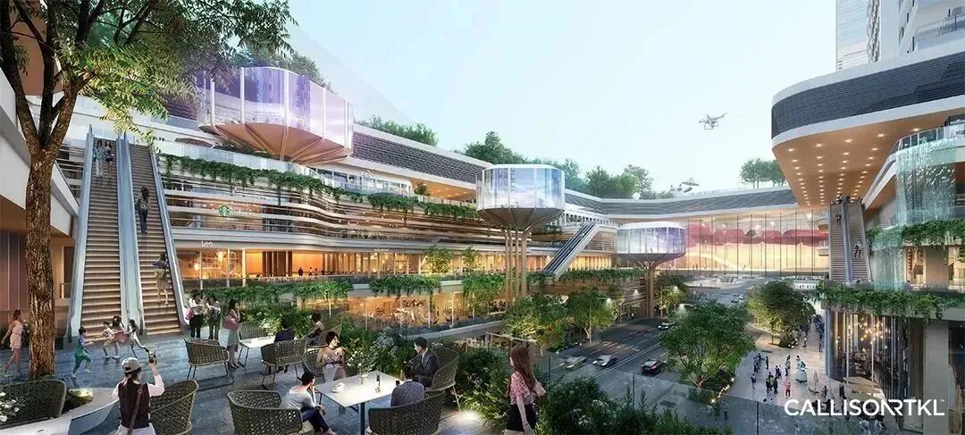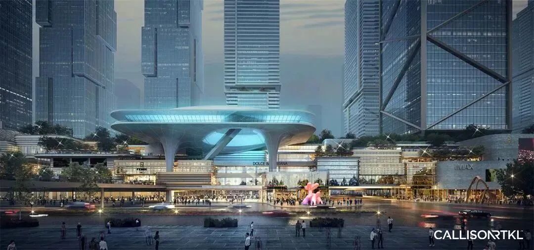 项目位处超高密度都市中心,周边地标塔楼林立。因此建筑采取优雅和消隐的形态,为城市空间带来放松和留白,避免大型交通枢纽造成的紧张感。而线性的街道和连廊纵横连结, 将超大型城市综合体的尺度化解,编织丰富多彩的街道样貌。街区融入新概念商业空间,演绎富于未来感、绿色低碳的公园化主题商圈。她将成为大湾区创意文化“发声地”,传达大湾区生活方式的美学示范场,具有高度的都市文化内涵。