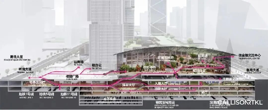 前海国际枢纽中心规模巨大,功能复杂。用地条件受5条轨交线路以及上部密集的9座塔楼的极大限制,因此本项目的设计可谓是“极限条件下的极限挑战”。但CRTKL和易加设计组成的联合体,采用“以城市为导向的综合设计策略”,迅速抓住项目核心关键,在超高层林立的极限条件下,巧妙平衡项目以及城市的多维需求。