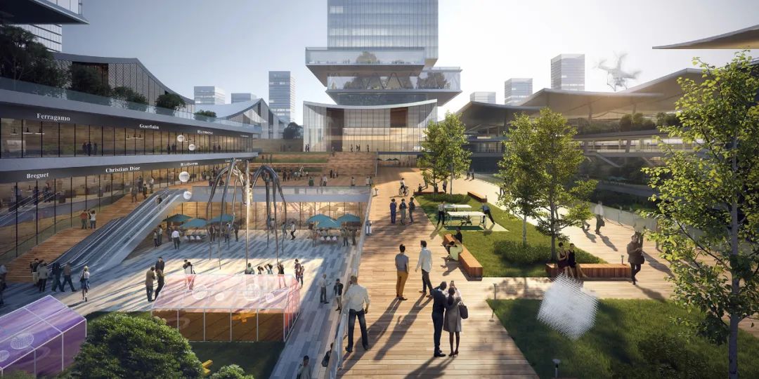 作为一个商务功能为主的区域,0101街区设计还创新性地引入社区化理念:围绕地铁站点、重要街道、水岸空间打造的特色商业文化服务轴带,融合功能共享的生活服务功能;以高度混合的功能和布局方式进一步盘活各类空间,激活城市的多元化全时活力,改变传统商务片区的单调氛围。