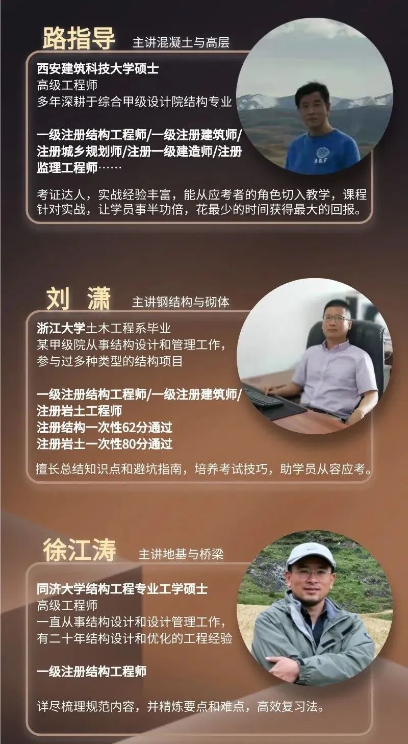 一流的讲师团队三名讲师都是优秀的考证达人+资深一线结构工程师,备考能力与实践经验双一流