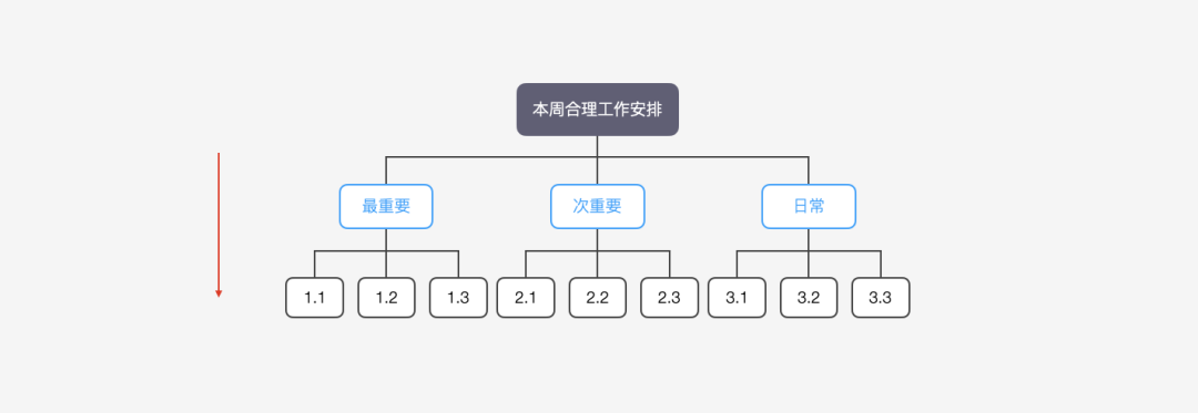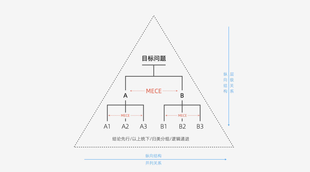 这个模式纵向上逐层分级,横向上相互并列,同组元素之间遵循MECE原则[即相互独立并完全穷尽]。