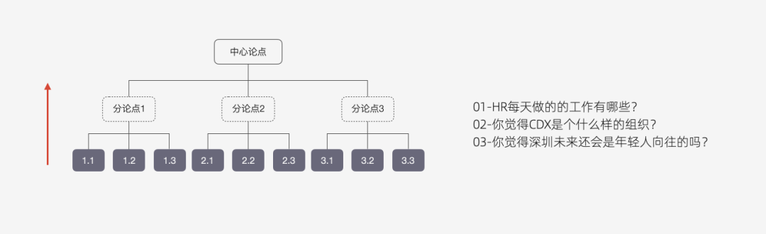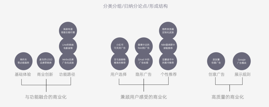 把收集的案例去除雷同项,分类合成小组,然后抽象出每组的观点和特征,也就成为了分组论点。这样一个基础的论点和分论点的结构就形成了。