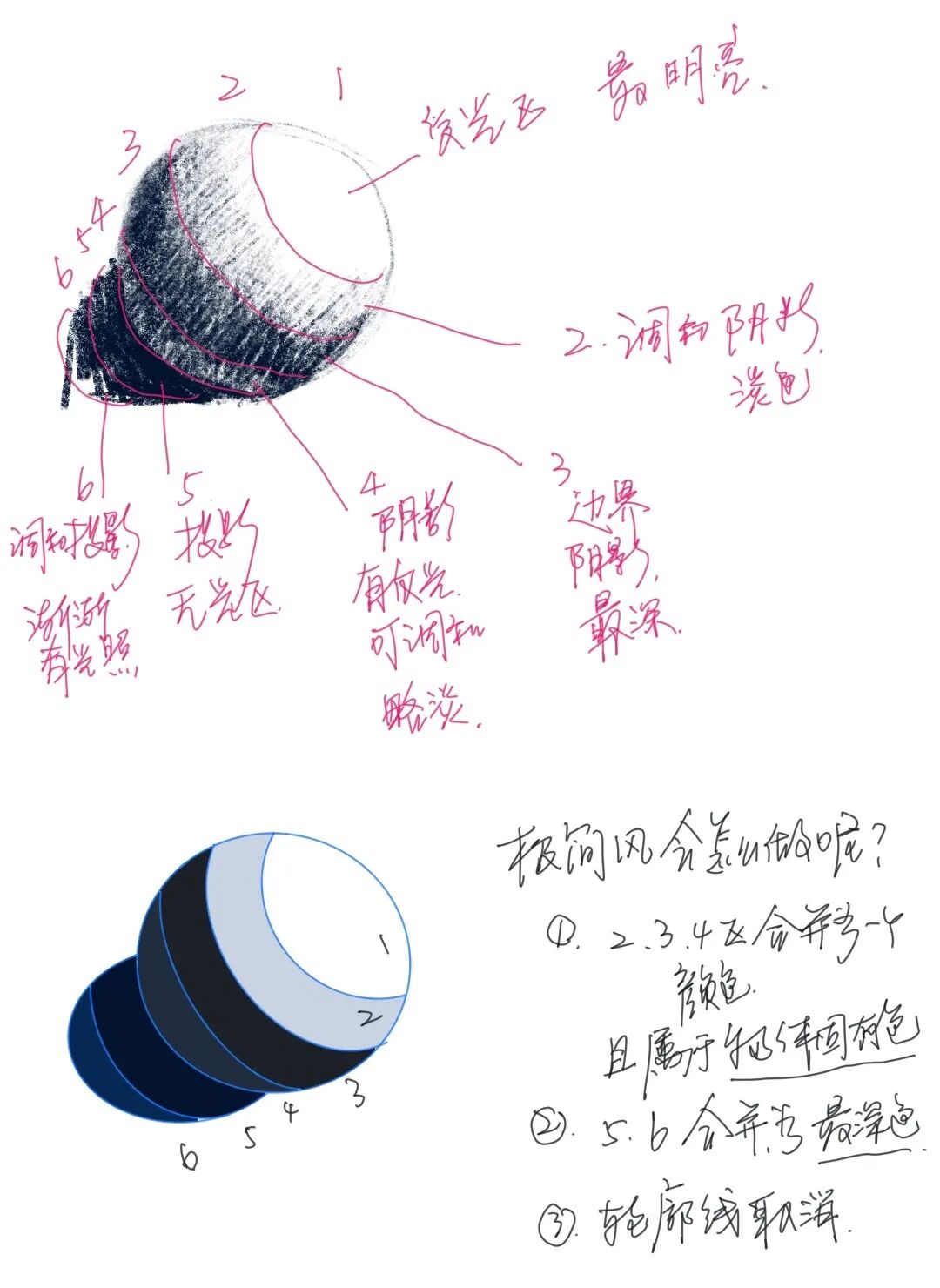 只需要四个颜色。高光就是纯白色。阴影区是固有色,投影处是最深色,加上一个背景色,就可以形成一个极简的球体。