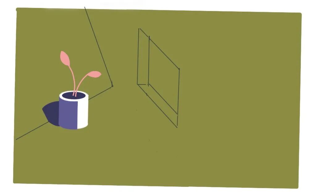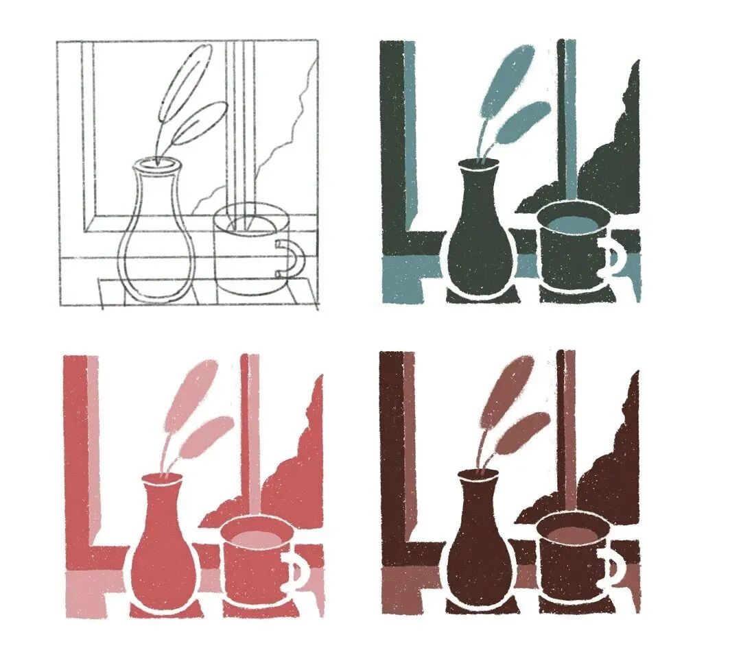 远处的山、窗户框、以及主体瓶子和杯子,三层空间及体积感,基本通过单色系建立好了。有时候越简单的事情越不容易做好,一旦做好了,控制更多颜色就会变得很容易,根据我前面提示的,首先控制好深色系的位置,再去填充浅色系,如果画面效果不好,就调整造型,让造型和配色相互配合调整。