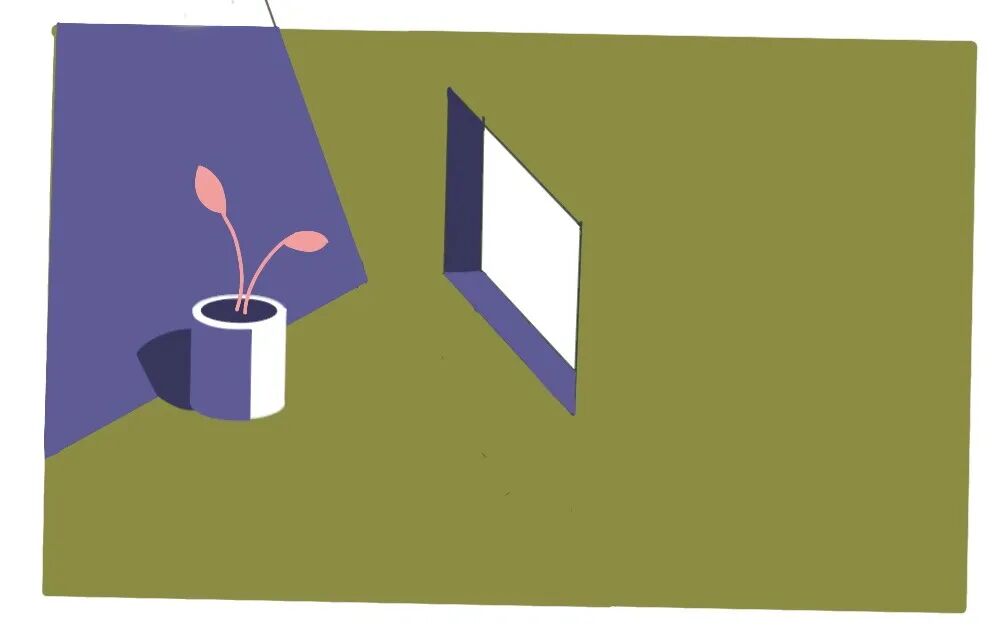 例如这副作品的构图,就是以光影为核心的构图(窗户及影子),花盆只是装饰这个画面(左边部分)。另外看看哪里缺颜色,尤其是需要深色压住重心),于是再补上一块颜色以达到画面的平衡(例如左下部分树叶凭空出现的意义)。所以这肯定不是写生,而是有意图以光影为核心的构图,表达艺术家心中的意境。