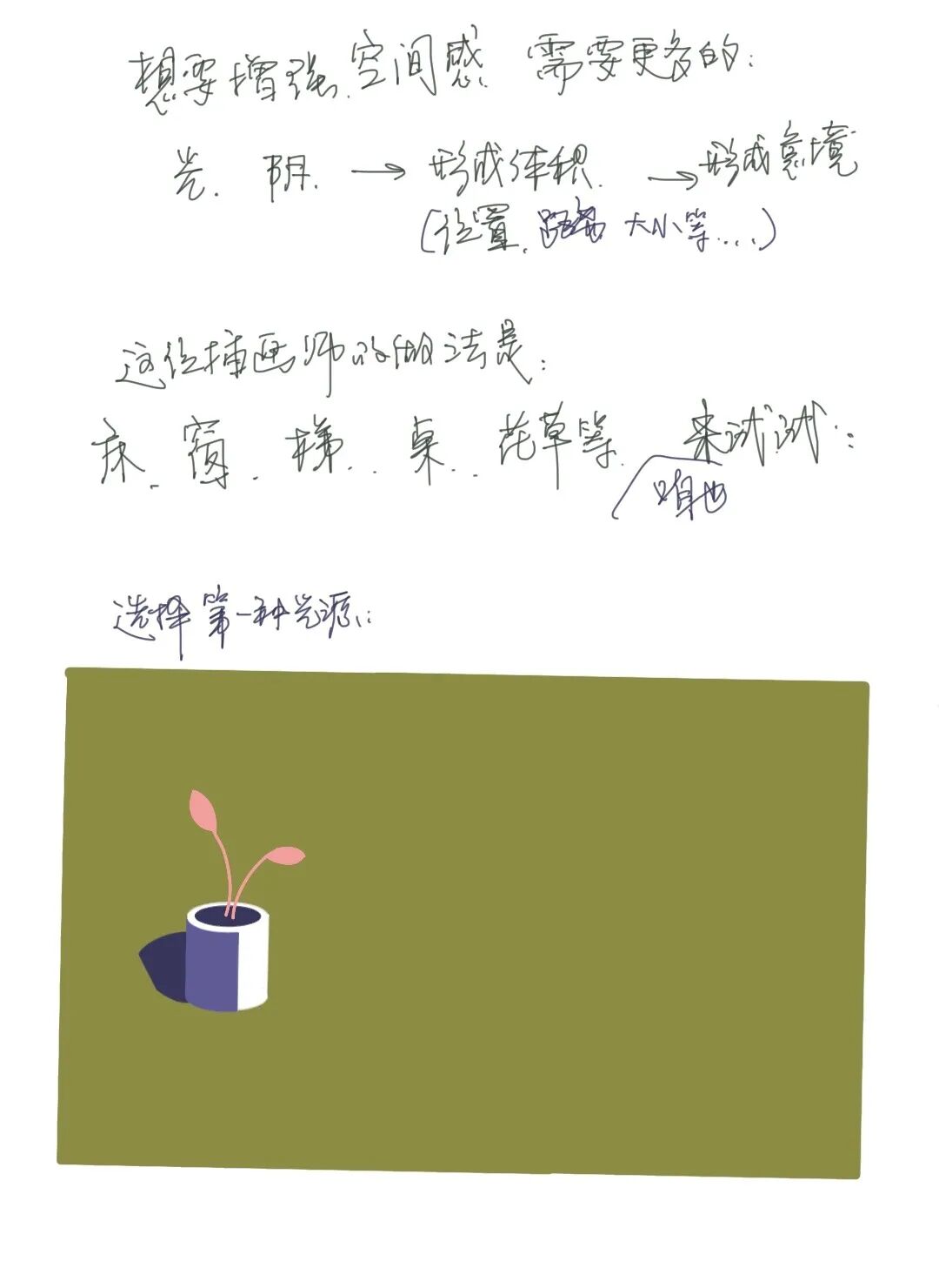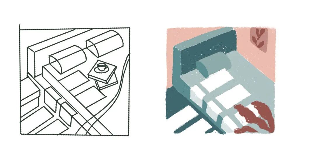 所以空间感一定要有参照物才能营造,你可以不画出桌面和墙壁,这不是写生,是主观选择后的一种创造。以上就简单的重构了一个小小插图。完成对最基本造型的解构。