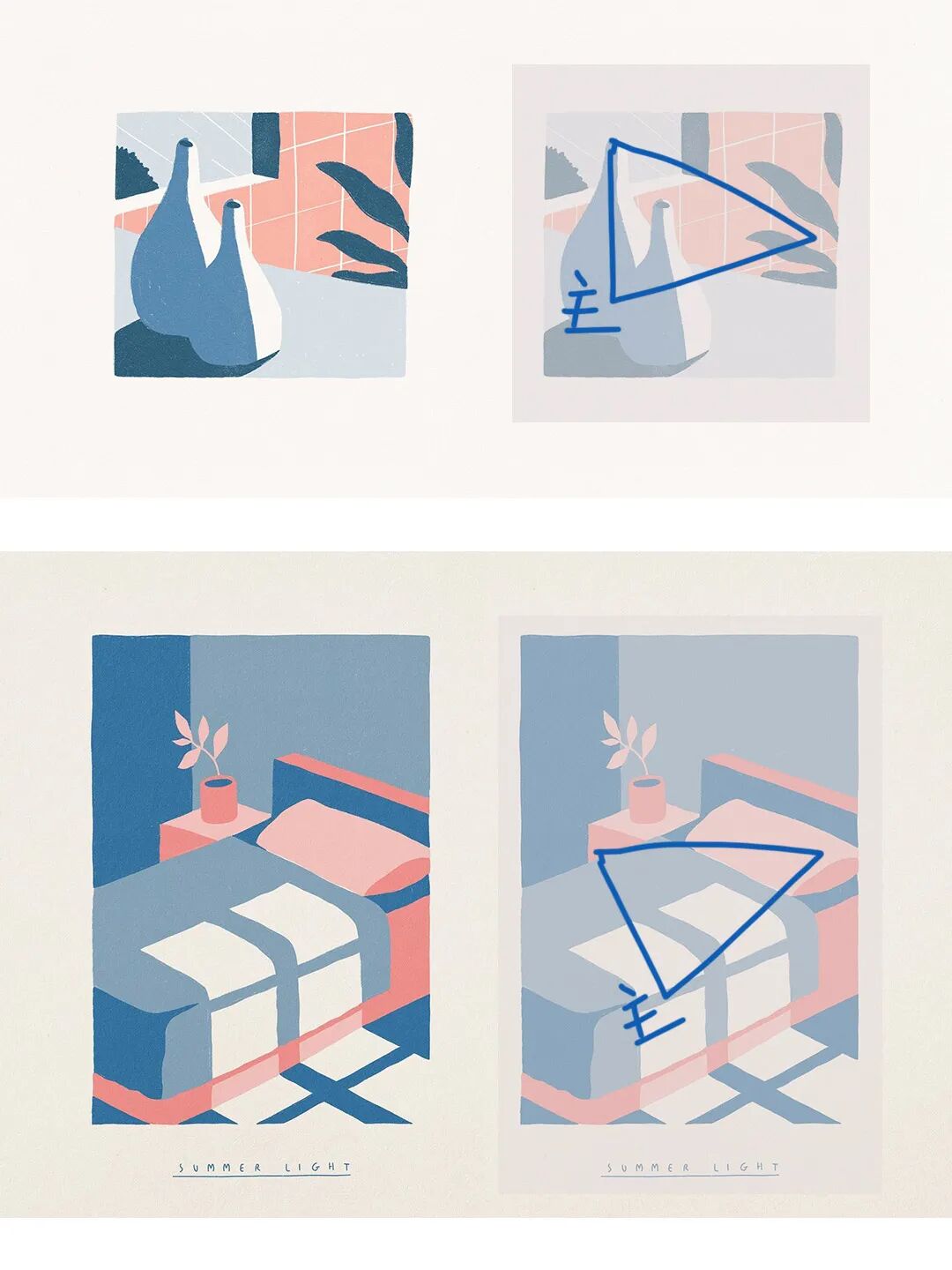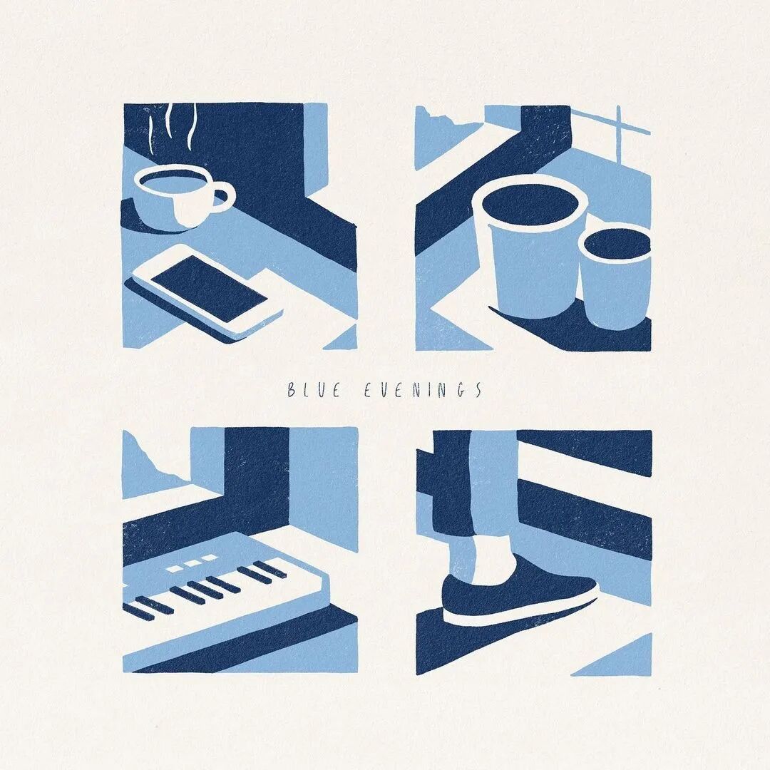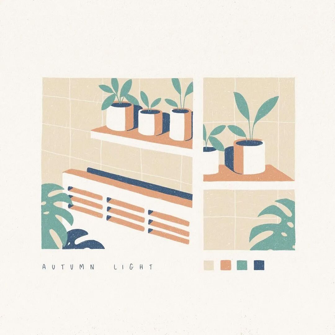 Miles Tewson的双色作品,主要是主体和客体分开。主体一个颜色,客体一个颜色。比如左上角,瓶子是主体,客体就是背景墙。画面也不需要完整展示一个场景,半拉事物的表达特别有趣,两套颜色恰好为极简的画面有效的提供了空间感。