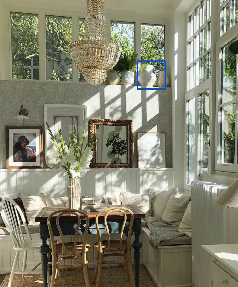 很好拿捏各种其他元素,比如颜色:瓶子阴影为最深色,花本身为最深色,窗户框子为最深色,窗户外的树木为最深色,这样三点构成的位置上都有最深色,画面特别容易平衡。