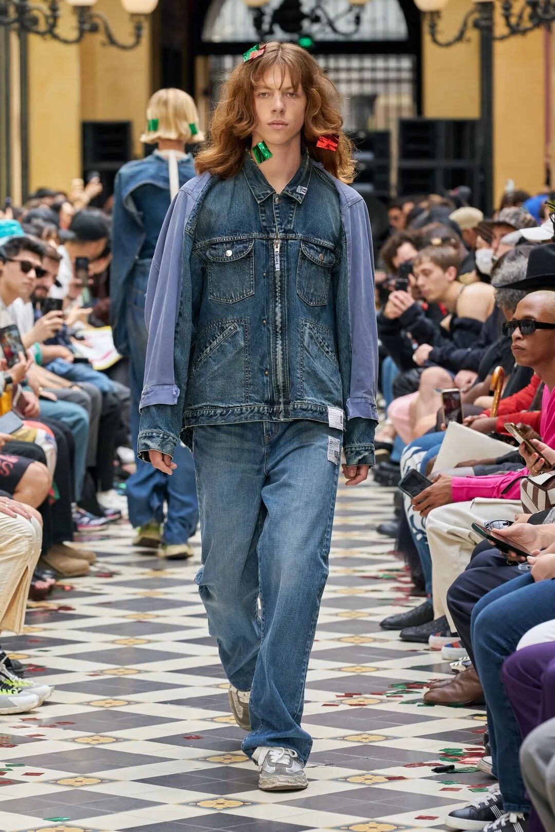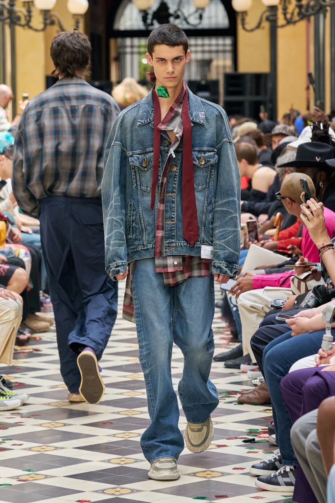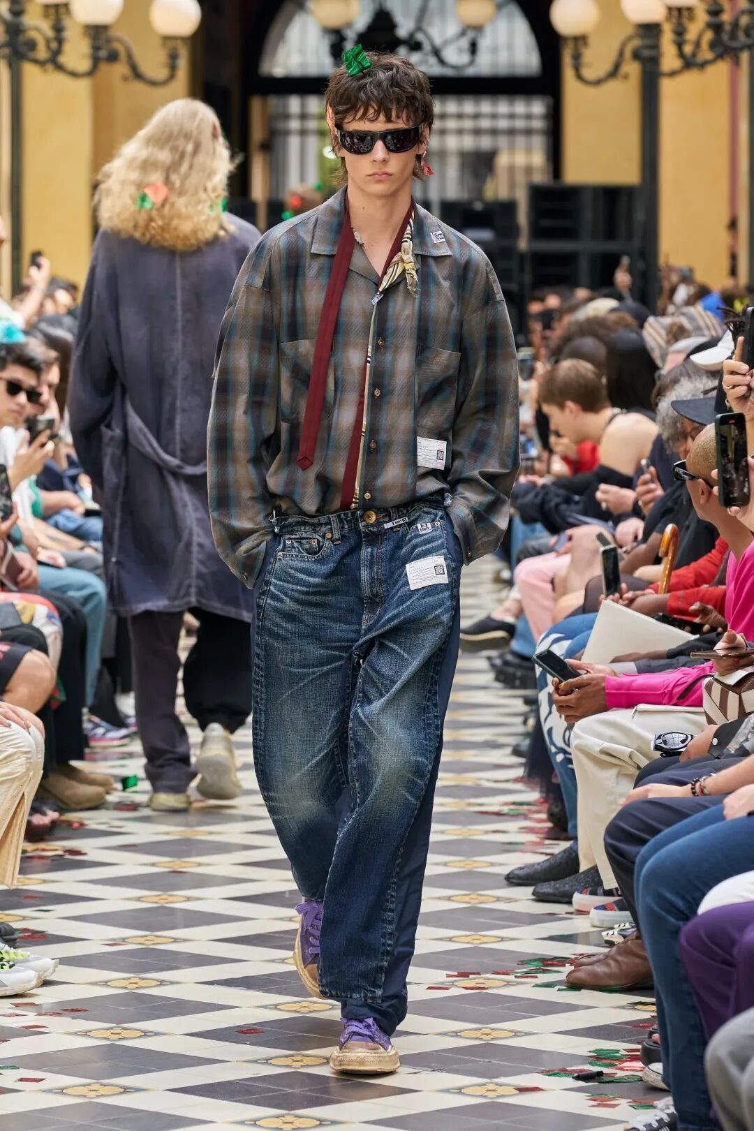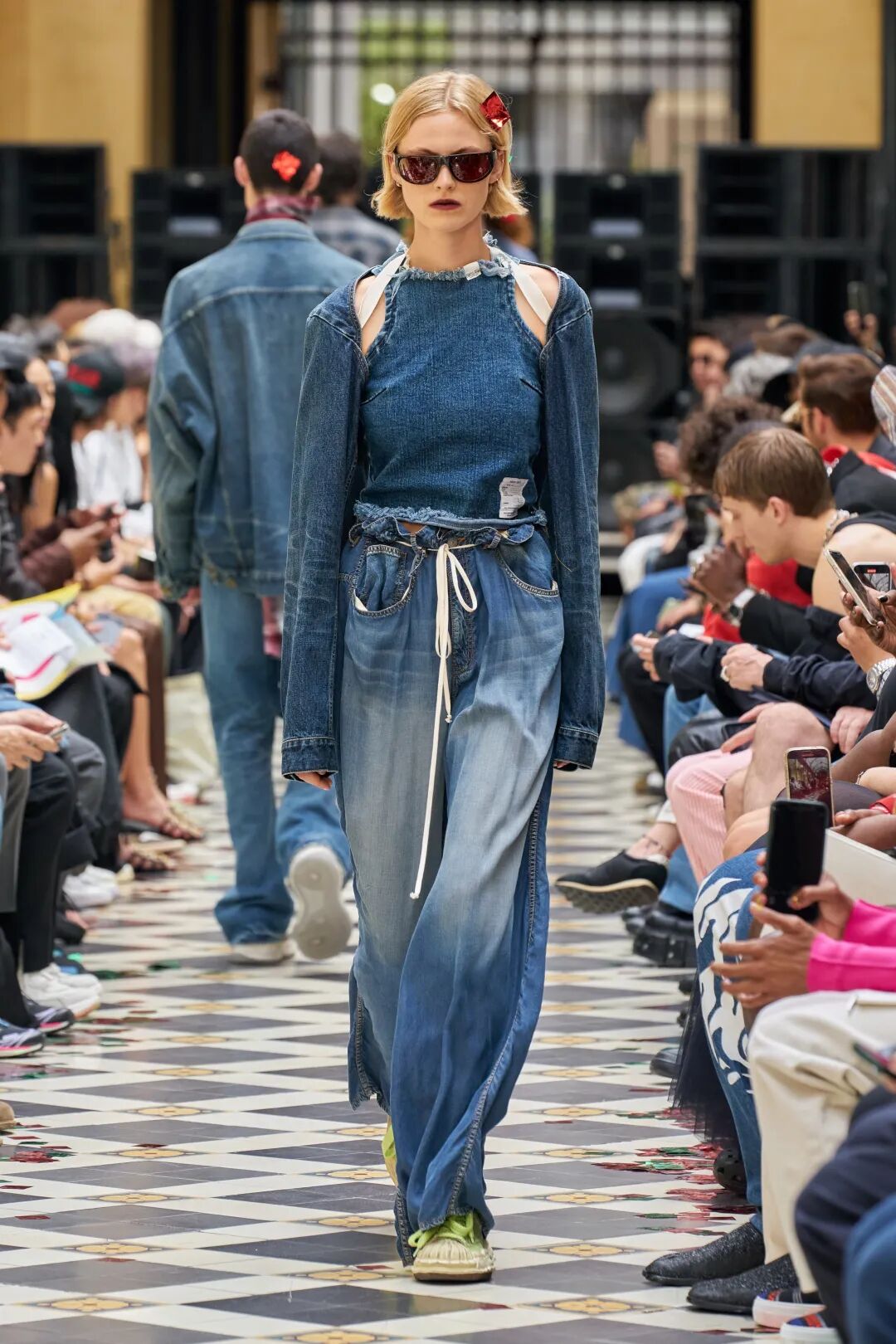 2023春夏系列,设计师依旧以解构主义为核心,利用拆解重组碰撞出美感。人们可以发现许多经典的Mihara Yasuhiro 元素,如流苏牛仔、针织面料、格纹双面拼接等。