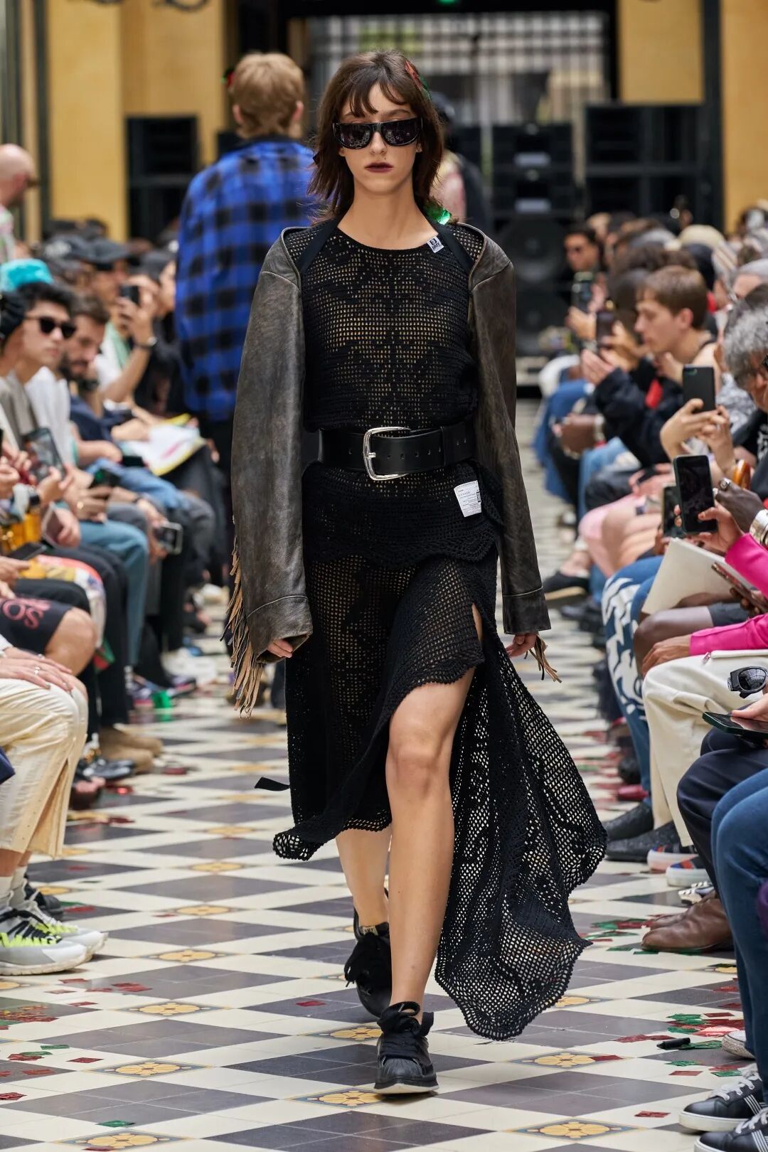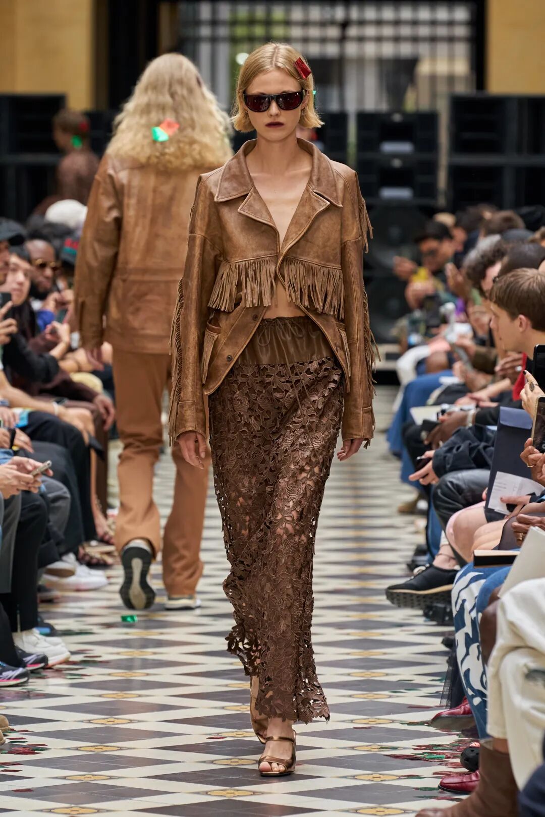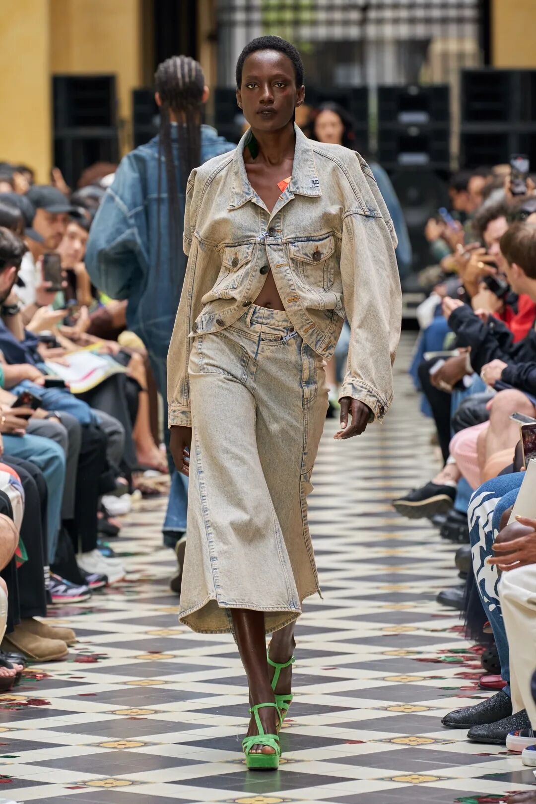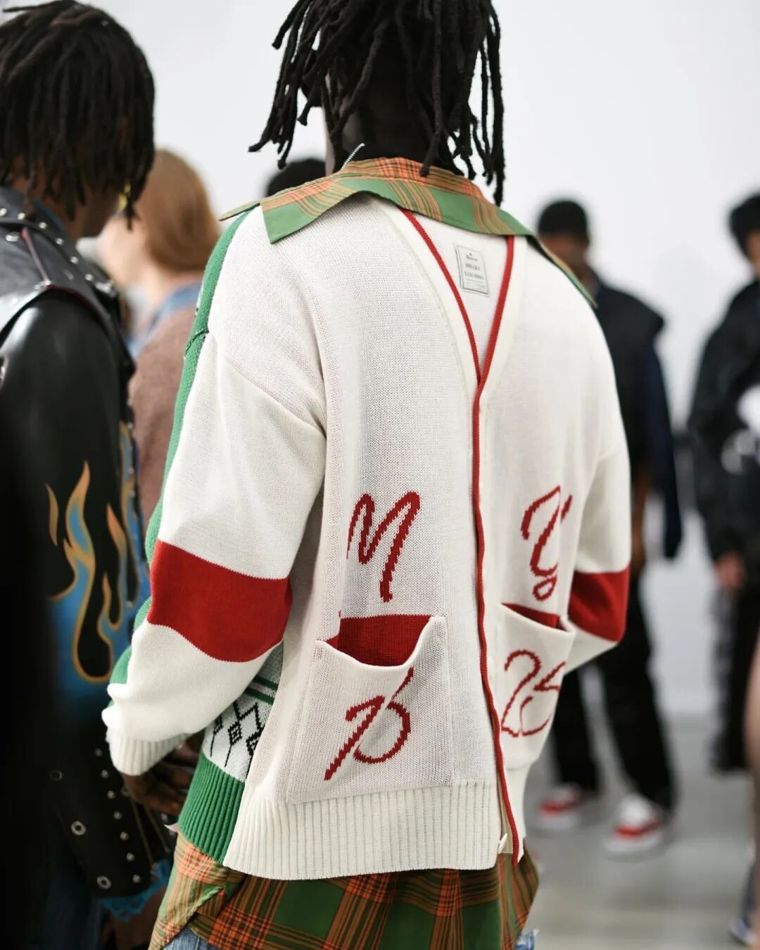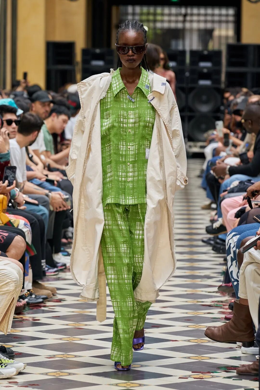 2023春夏系列,设计师依旧以解构主义为核心,利用拆解重组碰撞出美感。人们可以发现许多经典的Mihara Yasuhiro 元素,如流苏牛仔、针织面料、格纹双面拼接等。