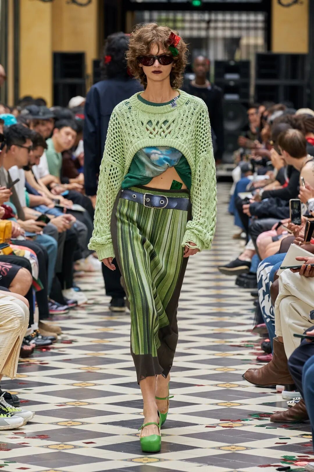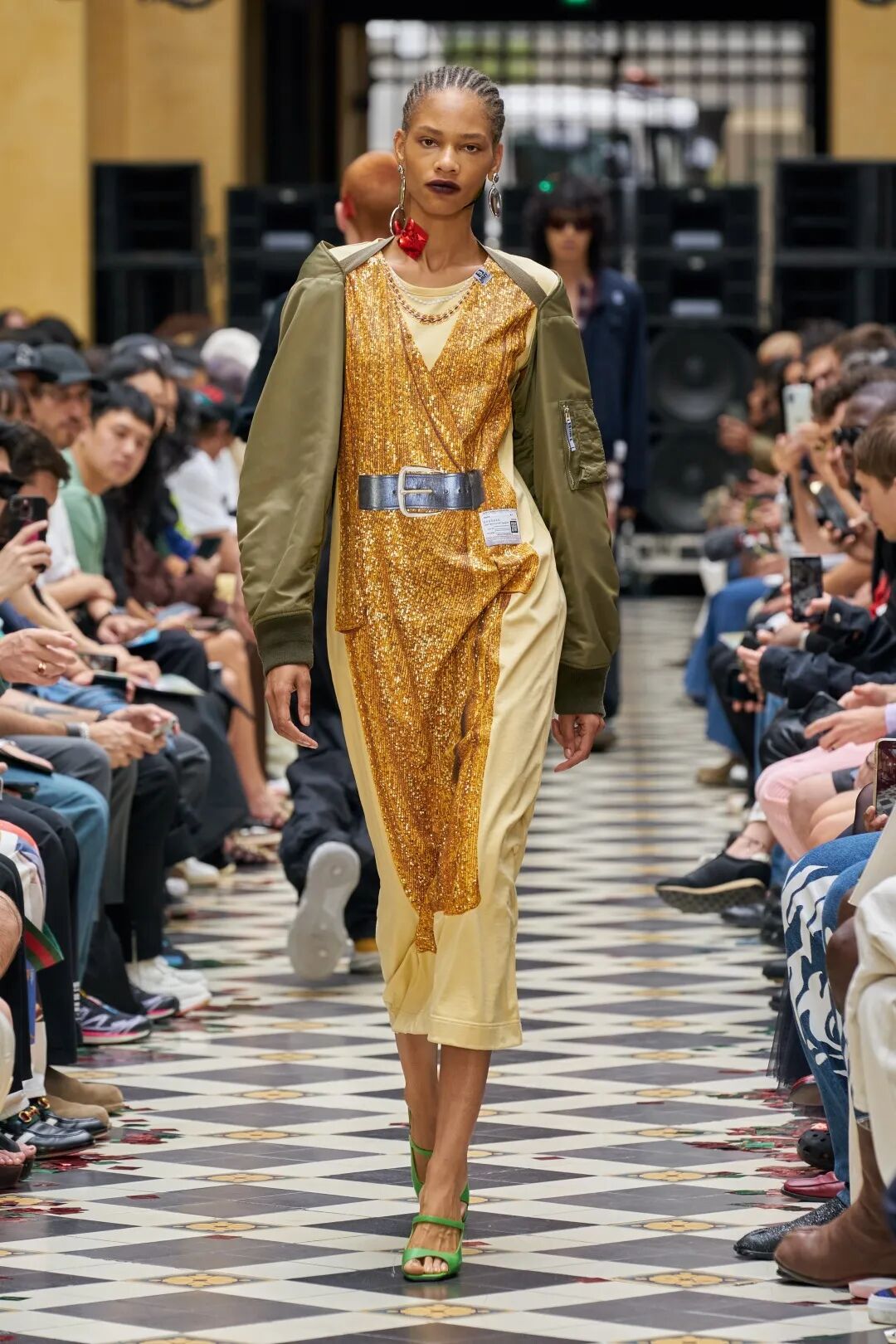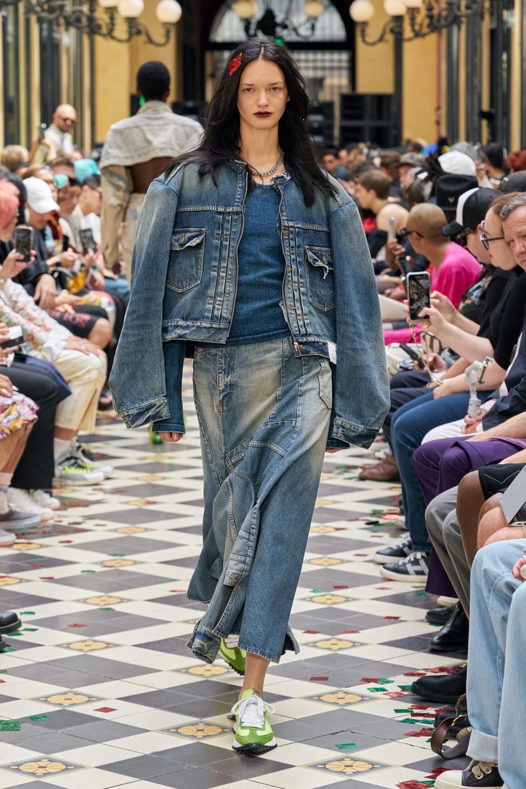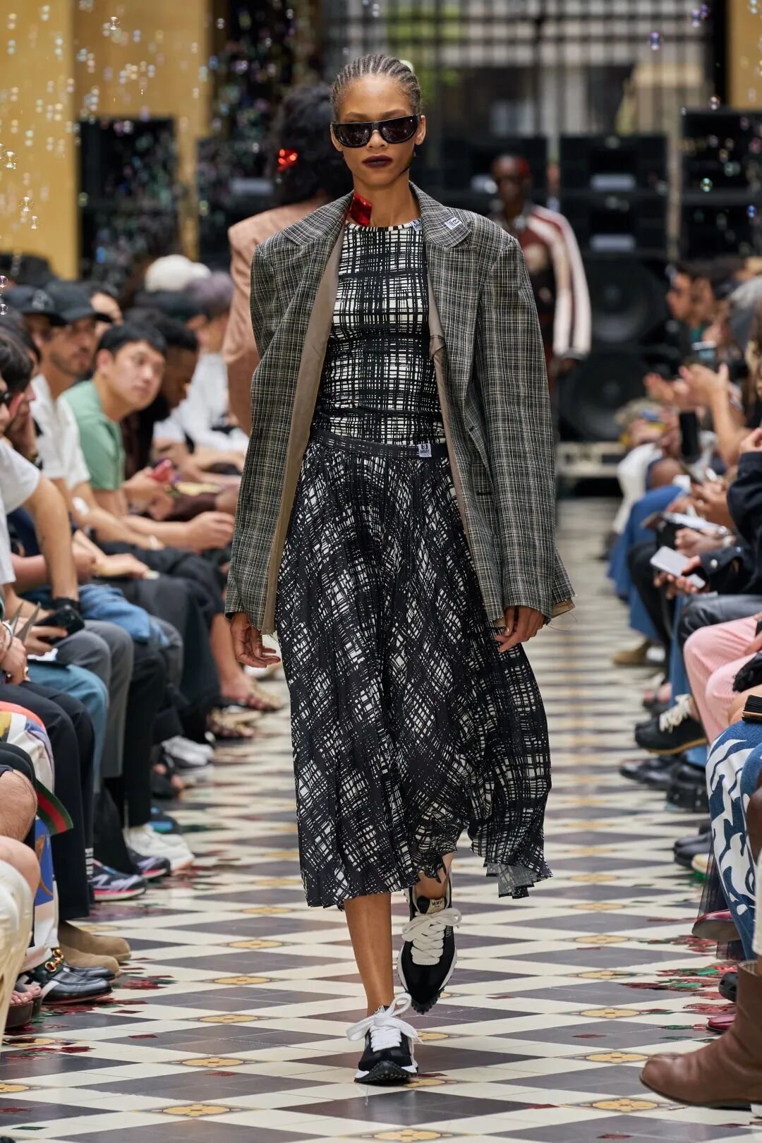 2023春夏系列,设计师依旧以解构主义为核心,利用拆解重组碰撞出美感。人们可以发现许多经典的Mihara Yasuhiro 元素,如流苏牛仔、针织面料、格纹双面拼接等。