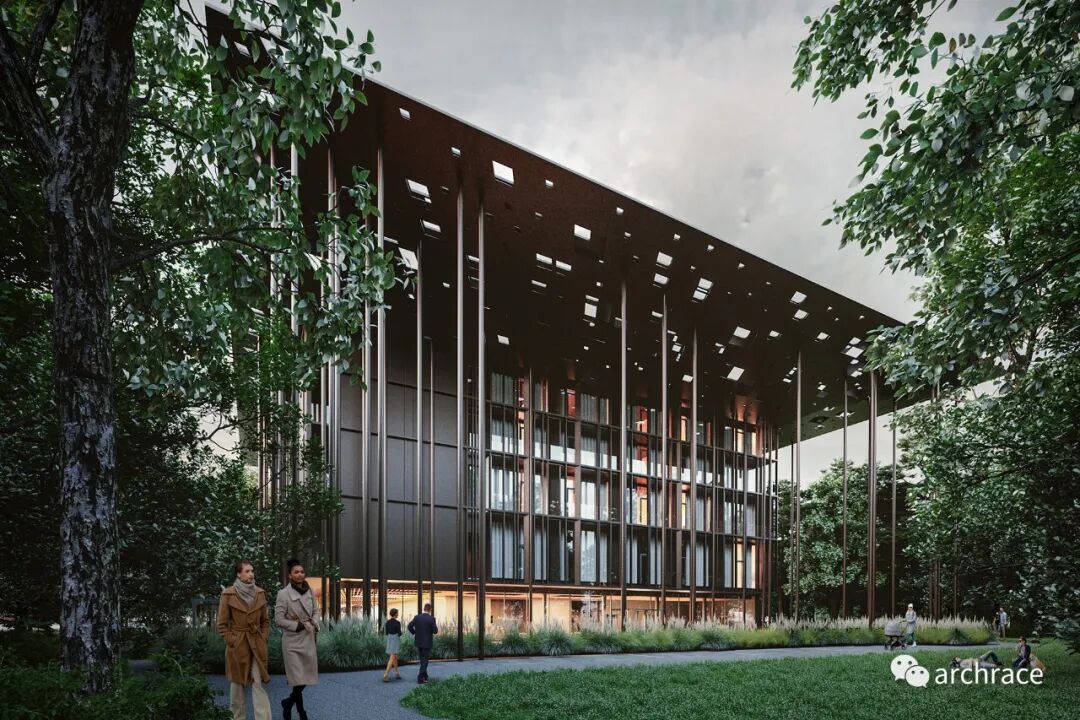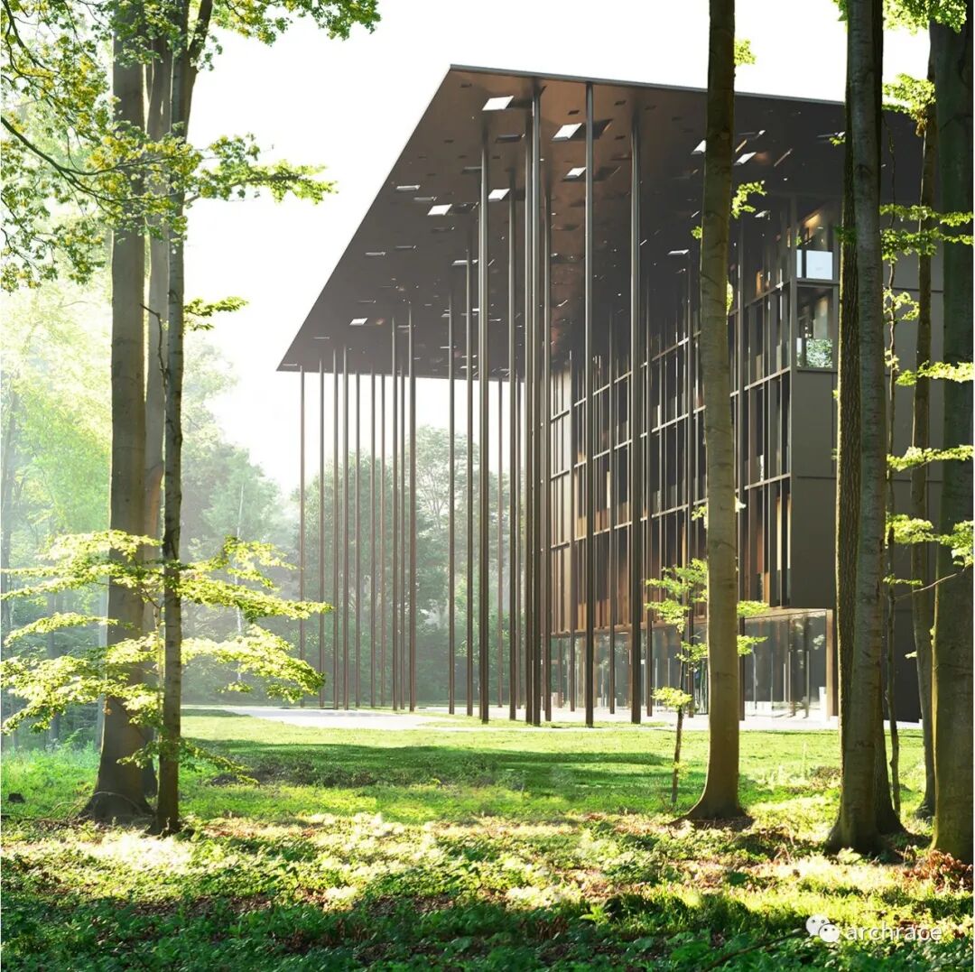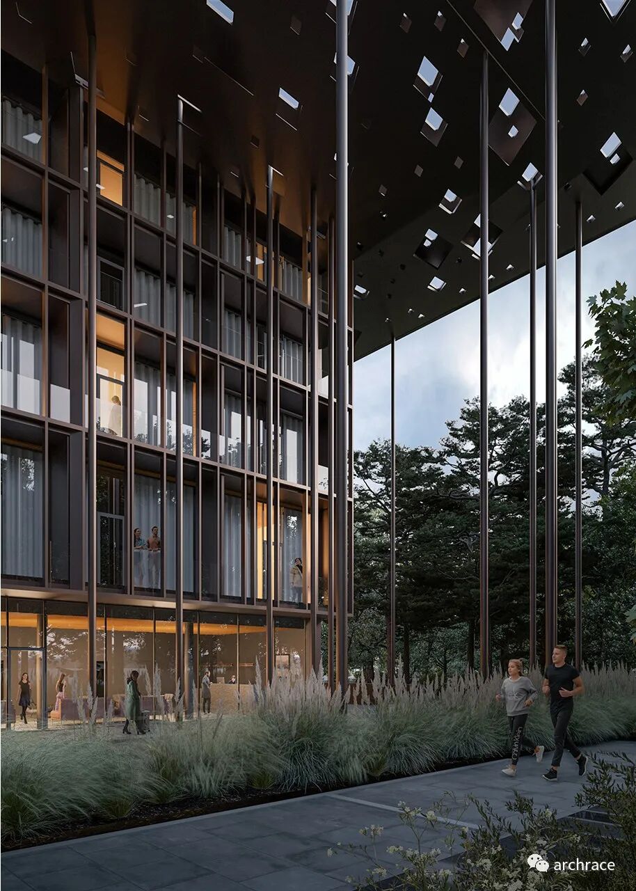 该设计基本上基于从道路接近建筑物的过程,这是看到建筑物出现在一条又长又窄的林间小路尽头的第一次体验。设计团队的愿景是,临建小路沿线茂密的森林树干和拟建建筑周围的柱状森林的景象、韵律和纹理将在每个人身上产生直接的视觉和逻辑联系,使对建筑的第一眼印象成为一种持久的体验。建筑顶部的穿孔雨棚和屋面的设计也在契合这一理念,雨棚在建筑的四个方向出挑,其中南面和西面出挑距离更大。屋顶的不规则菱形孔洞,让人联想到树木的叶子和它们的光影,这是对天然树冠的光影效果的人工模拟。建筑外立面的材料使用和颜色选择也是体现这一概念的重要元素:外立面采用铝和玻璃两种材料。铝材表面呈现出和周边树干接近的深棕红色调,而玻璃表面的反射参数则可以反映建筑物环境的抽象图像。