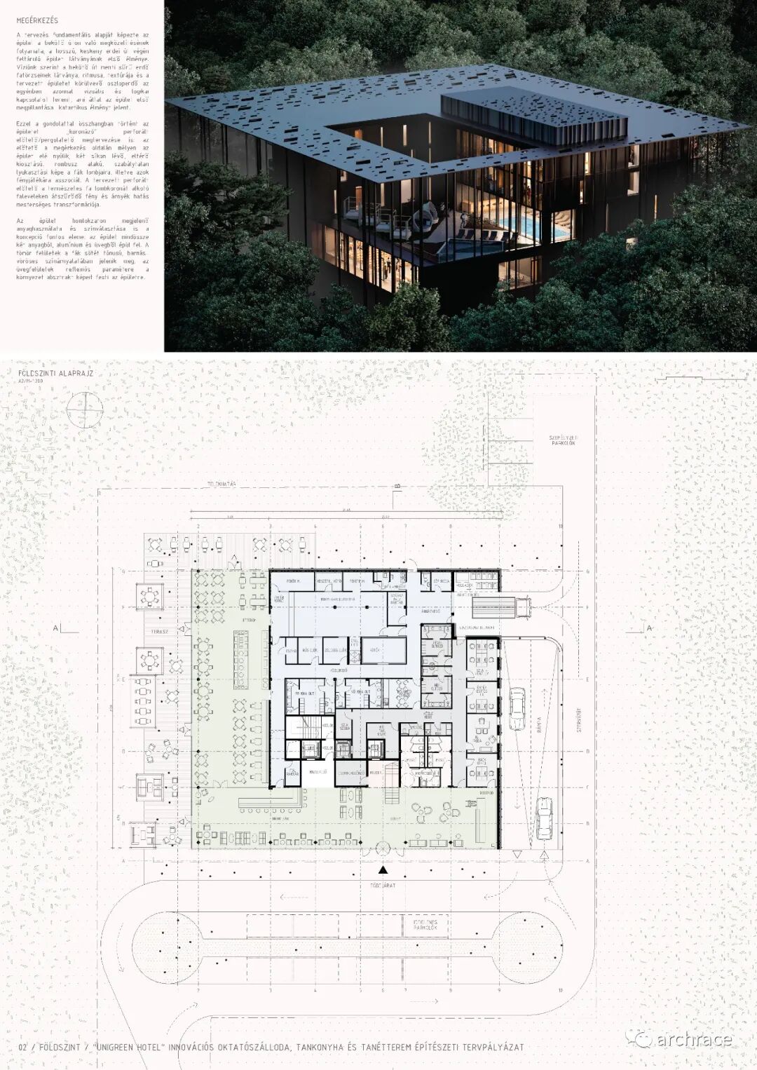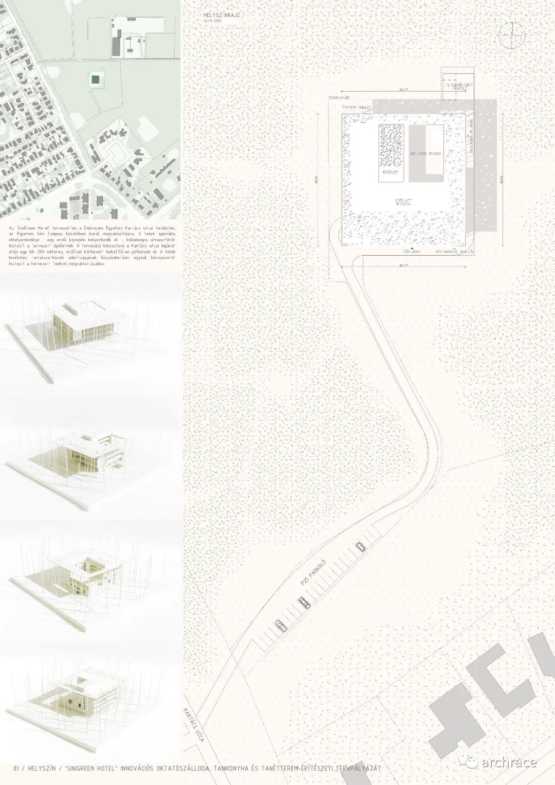 2018 年,德布勒森大学大学校长宣布购买 Nagyerde 开发区的前公园酒店物业,重新建造的创新培训酒店项目将作为该校酒店管理培训专业的基础,而其他的商业住宿将服务于日渐增多的旅游酒店专业学生在学校进行实践教育的需求。根据竞赛公告称,该项目将按照四星级标准建设,建筑高度在4-6层左右,包含50-60间双人间客房,以及1-2套4人间公寓客房。公共功能包含餐厅、厨房、酒吧、可容纳至少80人的小会议室,总建筑面积约4000平方米。竞赛公告提到:“未来的建筑需要能够很容易地定位,而且由于场地的特性,它需要为大学提供良好的环境。创造舒适、现代和健康,以及一个提供优质文化环境和自然环境的住宿和教育建筑”。
