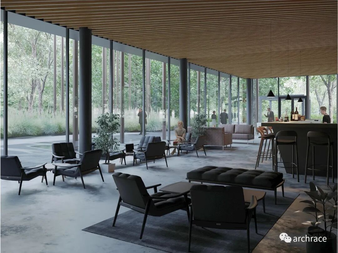 在建筑内部空间的材料和颜色的使用上延续了立面设计的原则,空间以深色、中性(灰色)内墙和天然木地板表面为主。使用柔和、中性的室内色彩强调外部环境的视觉冲击,这让大堂和餐厅空间的访客不可避免地向外看向森林。室内设计不会分散人们对自然美景的注意力,森林为室内外空间提供主要的视觉效果和色彩影响力。
