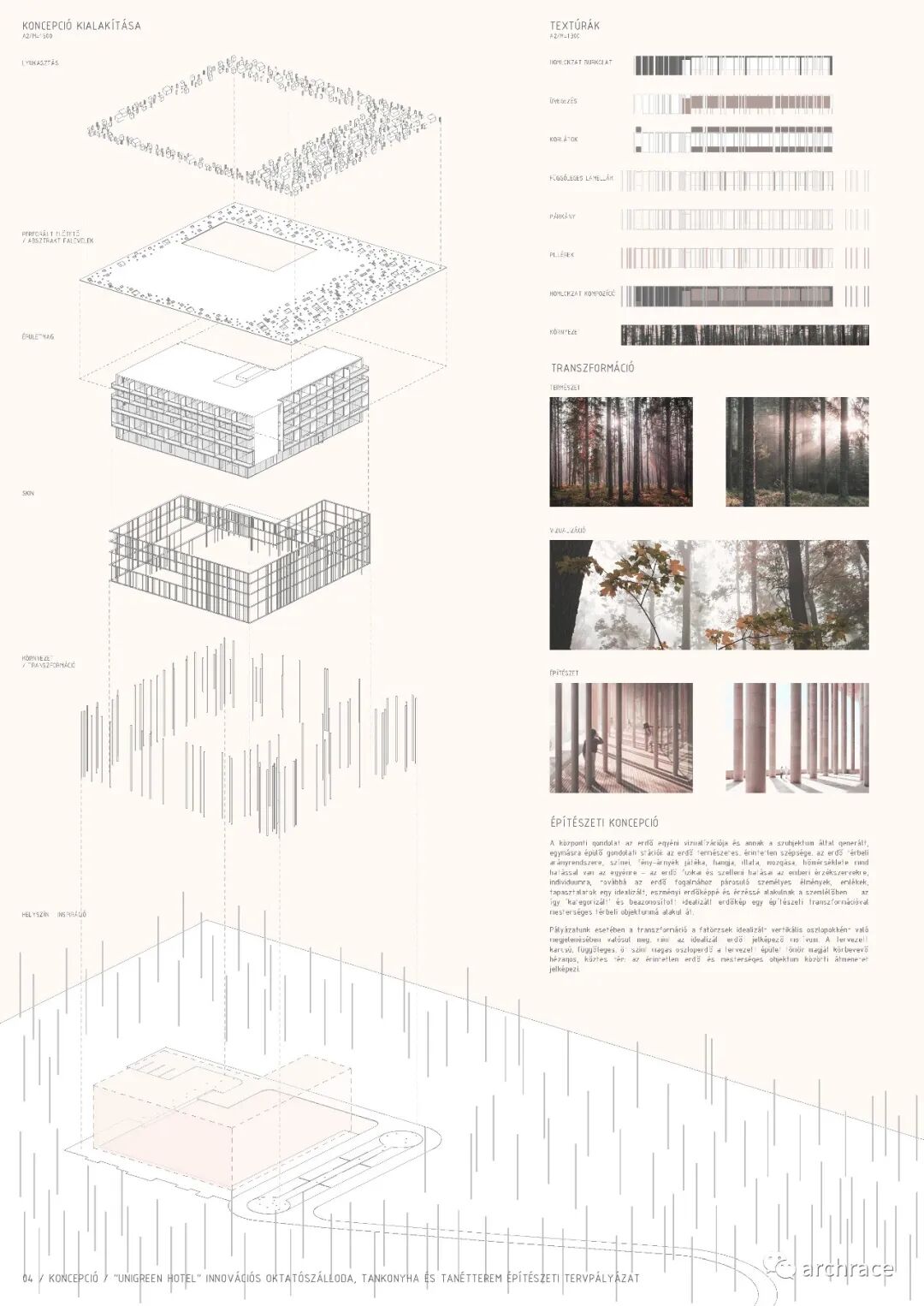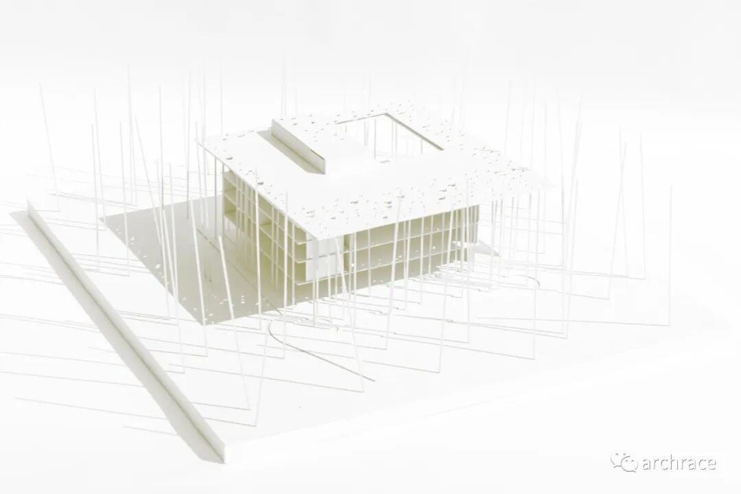 建筑概念核心是对“森林”的抽象化及其与个体产生的相互依存关系:森林的自然、原始的美和它的空间比例、色调、光影的变化、声音、气味、运动、温度,都会对个体产生影响——森林对人类感官、个体的生理和心理影响,以及与森林概念相关的个人体验、记忆和情感都转化为理想化的、抽象的森林形象和观者的感受。抽象化的森林形象,因此被“分类”和识别,通过建筑手法转化为人造空间对象。在方案的具体操作中,将树干转化为抽象化的立柱作为森林的主题。方案中细长、垂直、五层高的柱林代表了建筑实体核心周围的空隙空间,是原始森林和人造建筑之间的空间过渡。